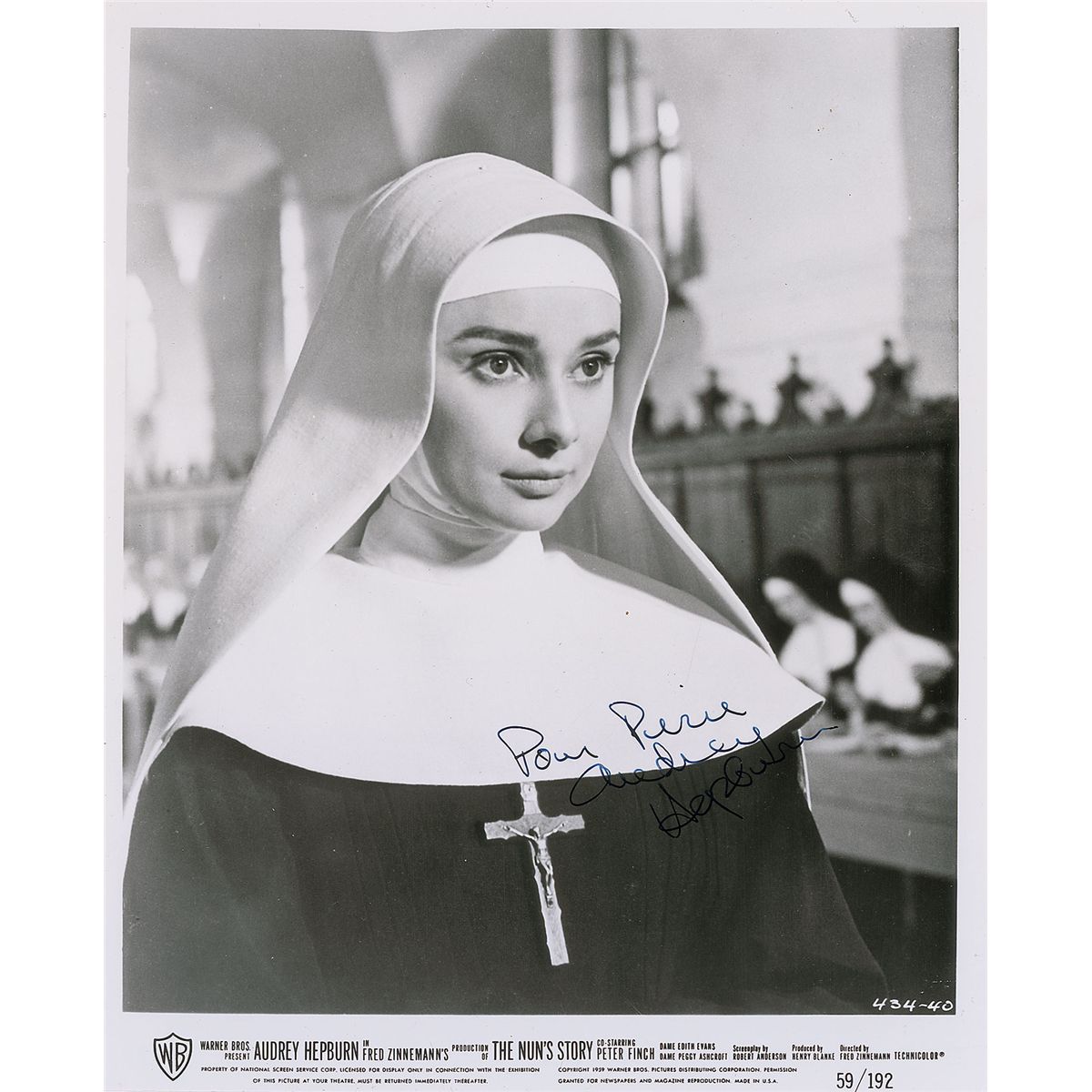 Desirable glossy 8 x 10 Warner Bros. promotional photo for The Nun’s Story, signed and inscribed in person in fountain pen, “Pour Pierre, Audrey Hepburn.” A few mild bends and creases to edges (in no way affecting the beautiful image) and some light contrast to her signature against the dark background, otherwise fine condition.