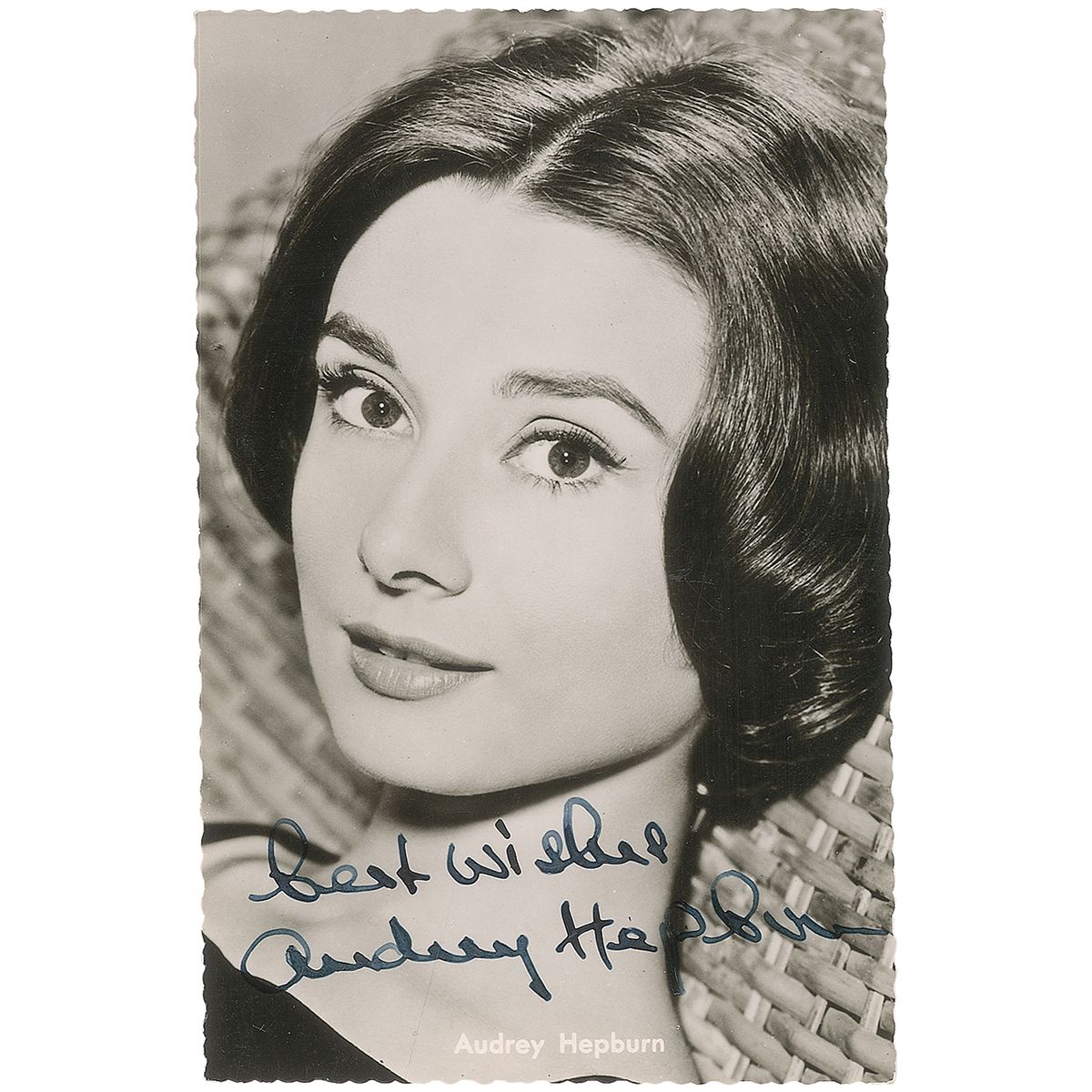 Superlative vintage glossy 3.5 x 5.25 postcard photo, signed in fountain pen, “Best wishes, Audrey Hepburn.” In fine condition. A positively gorgeous image.