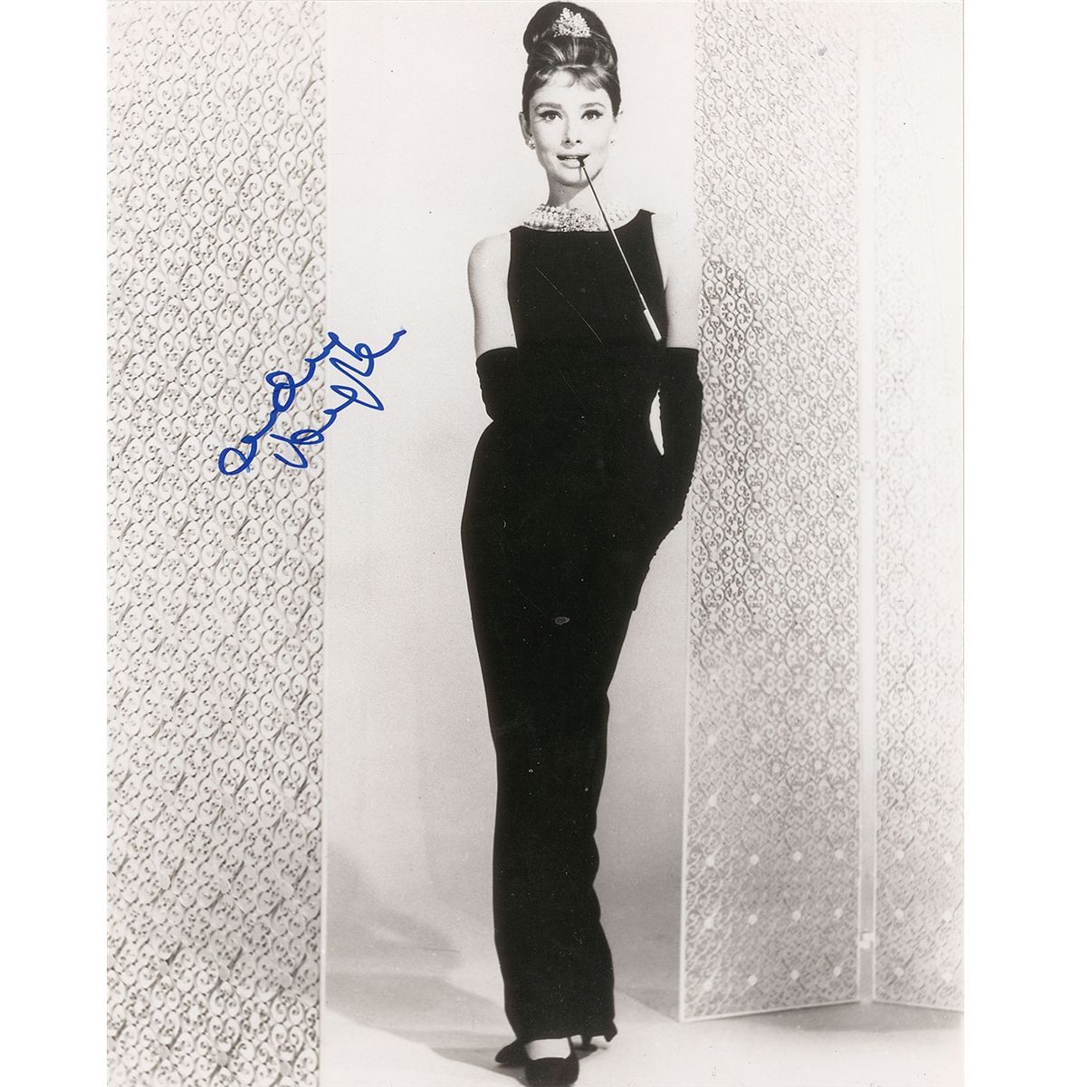 Beautiful glossy 8 x 10 photo of Hepburn in her famous Breakfast at Tiffany’s dress, signed in blue felt tip. In fine condition.