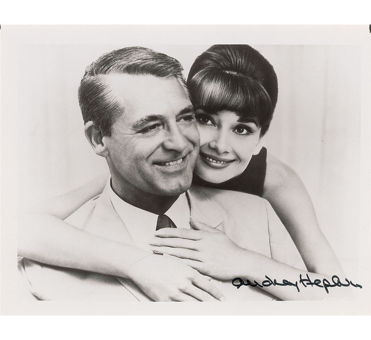 Glossy 10 x 8 photo of Hepburn with her arms around Cary Grant from the 1963 film Charade, signed in black felt tip. In very fine condition.