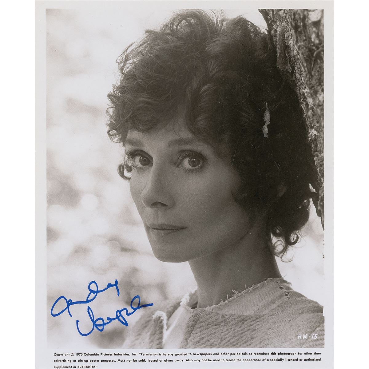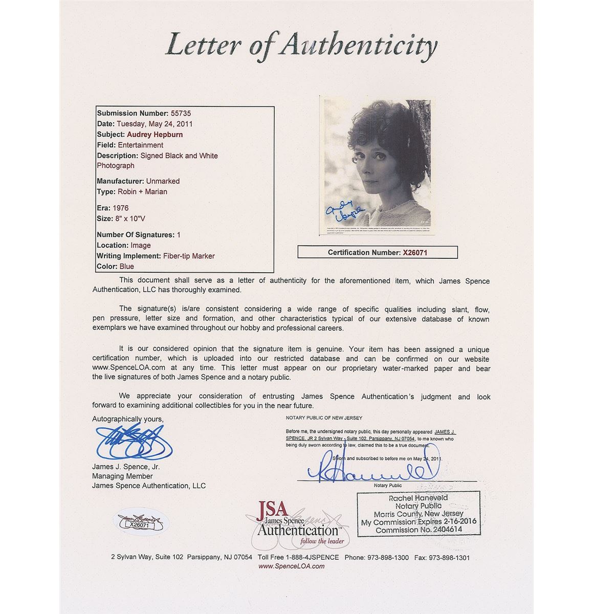 Glossy 8 x 10 Columbia Pictures publicity photo of Hepburn from the 1976 film Robin and Marian, signed in blue felt tip. Scattered light creases and surface marks, and some light brushing to signature, otherwise fine condition. Accompanied by a full letter of authenticity from JSA.