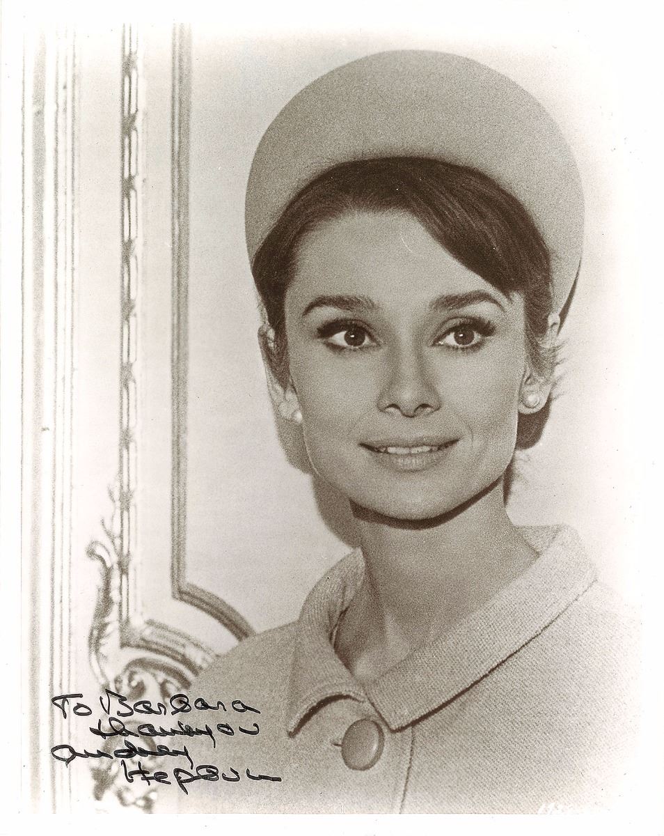 Glossy 8 x 10 photo of Hepburn as Regina Lampert from the 1963 film Charade, signed and inscribed in black felt tip, “To Barbara, thank you, Audrey Hepburn.” In fine condition.