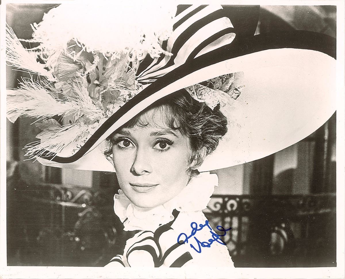 Glossy 9.75 x 8 photo of Audrey Hepburn as Eliza Doolittle from the 1964 film My Fair Lady, signed in blue felt tip. In fine condition, with a short tear to bottom edge.