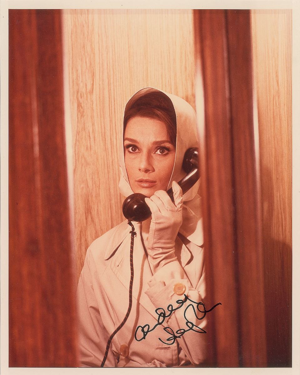 Appealing color glossy 8 x 10 photo of Hepburn making a phone call in the 1963 film Charade, signed in black felt tip. In fine condition.
