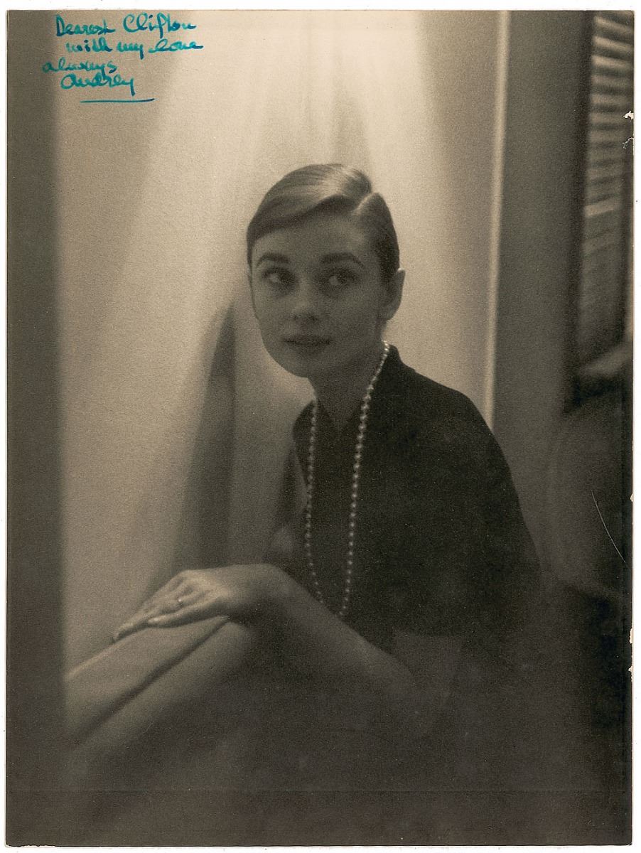 Vintage pearl-finish 7 x 9.25 photo of Hepburn, signed and inscribed to actor Clifton Webb in blue fountain pen, “Dearest Clifton, with my love always, Audrey.” In fine condition, with slightly trimmed edges and a few inconsequential creases to background.