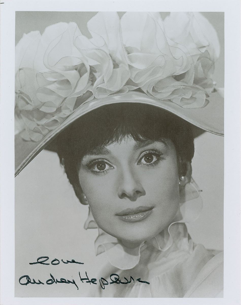 Gorgeous glossy 8 x 10 photo of Hepburn from My Fair Lady, signed in black felt tip, “Love, Audrey Hepburn.” In fine condition, with some small scattered surface impressions.