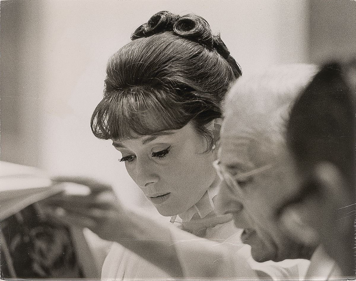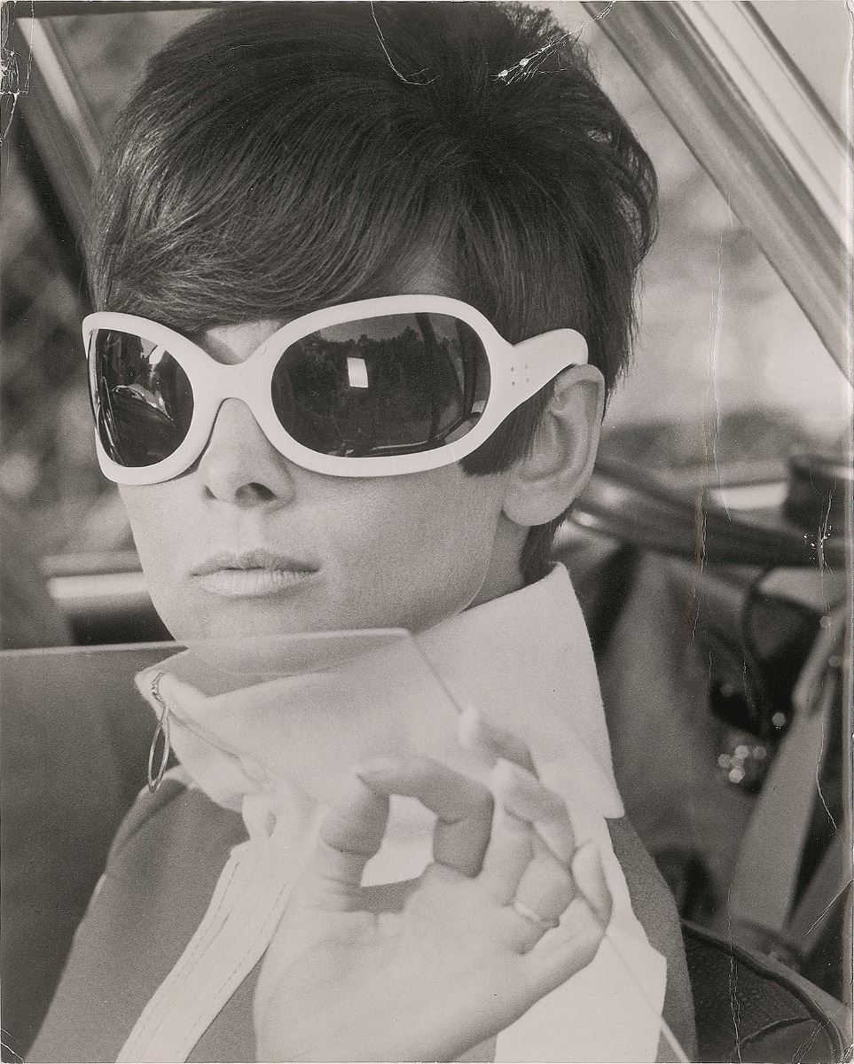 Two vintage silver gelatin photos: a glossy 9.25 x 7.5 photo of Hepburn during the production of My Fair Lady, bearing an Alan T. Band credit stamp and affixed caption on the reverse; and a glossy 8 x 10 photo of the fashionable actress wearing big sunglasses in the 1967 film Two for the Road, bearing an Anthony J. Corso credit stamp on the reverse. In overall very good condition, with several noticeable creases to both.