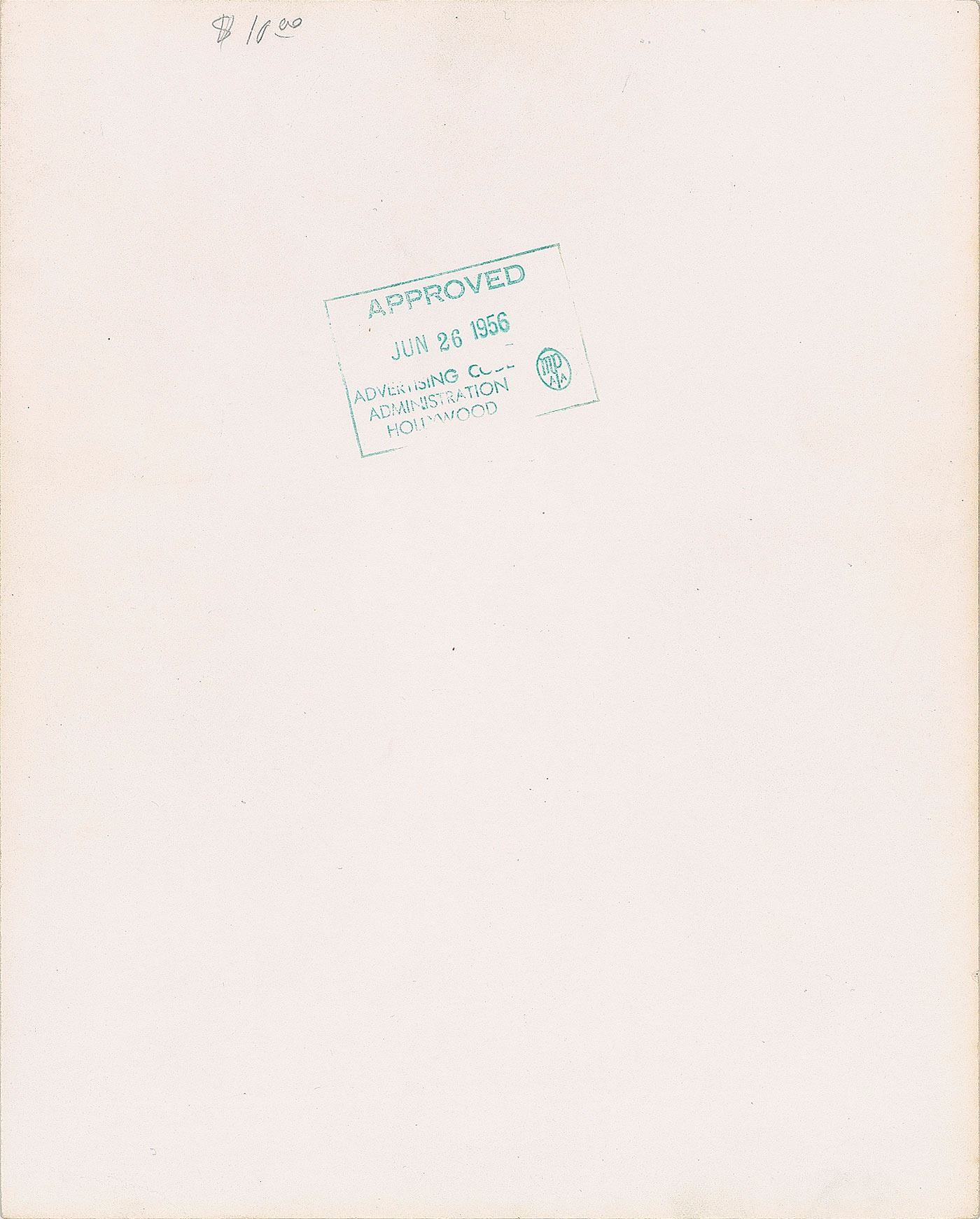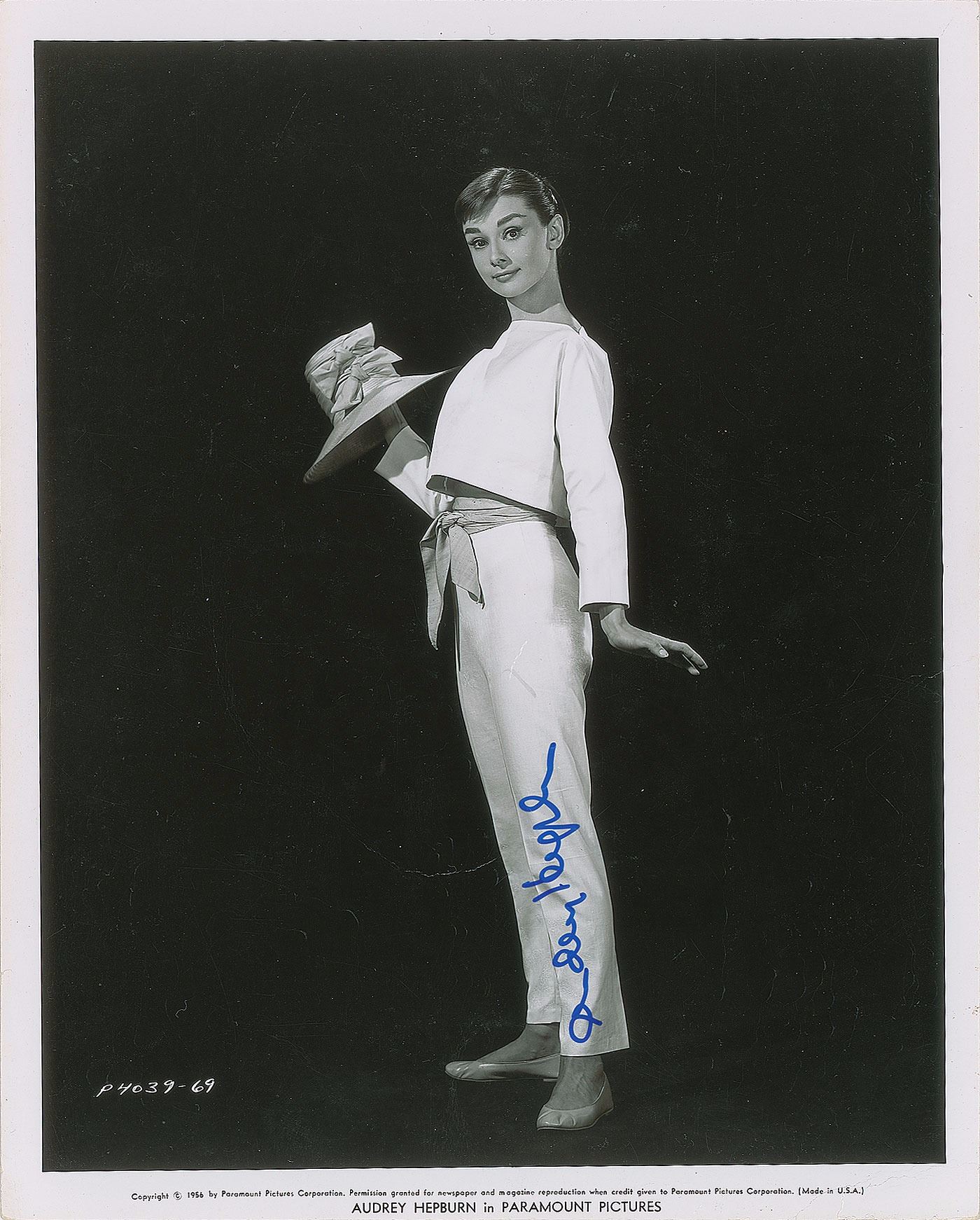 Stunning glossy 8 x 10 Paramount publicity photo of Hepburn from 1956, signed vertically in blue felt tip. Reverse is stamped "Approved" with a date of June 26, 1956. In very good to fine condition, with a few surface creases and some rippling to emulsion. A simply beautiful image of one of Hollywood's biggest stars. From the Harvey and Rhoda Kuflik Collection.