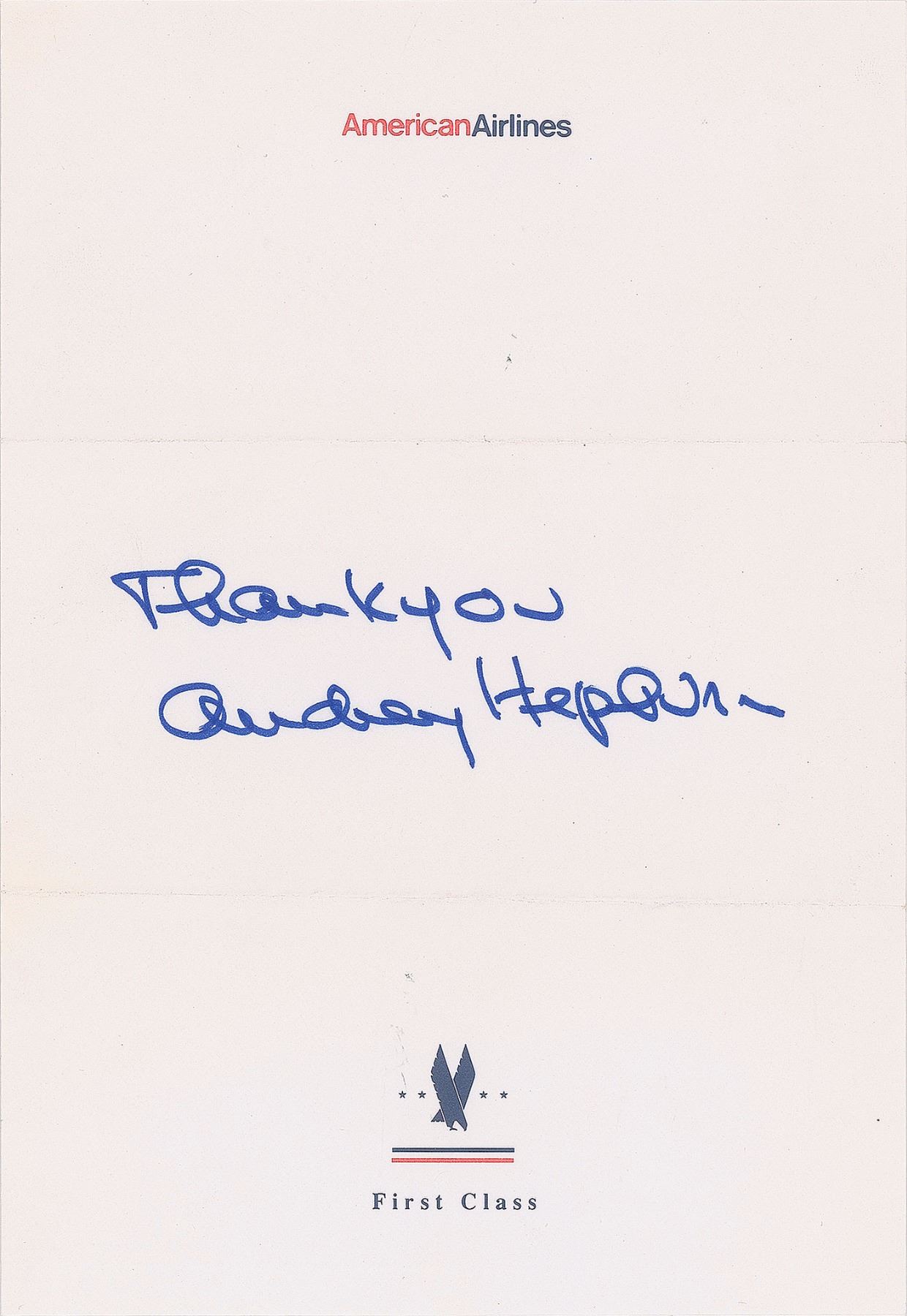 Felt tip signature, "Thank you, Audrey Hepburn,” on an off-white 5.5 x 8 sheet of American Airlines stationery. In fine condition.