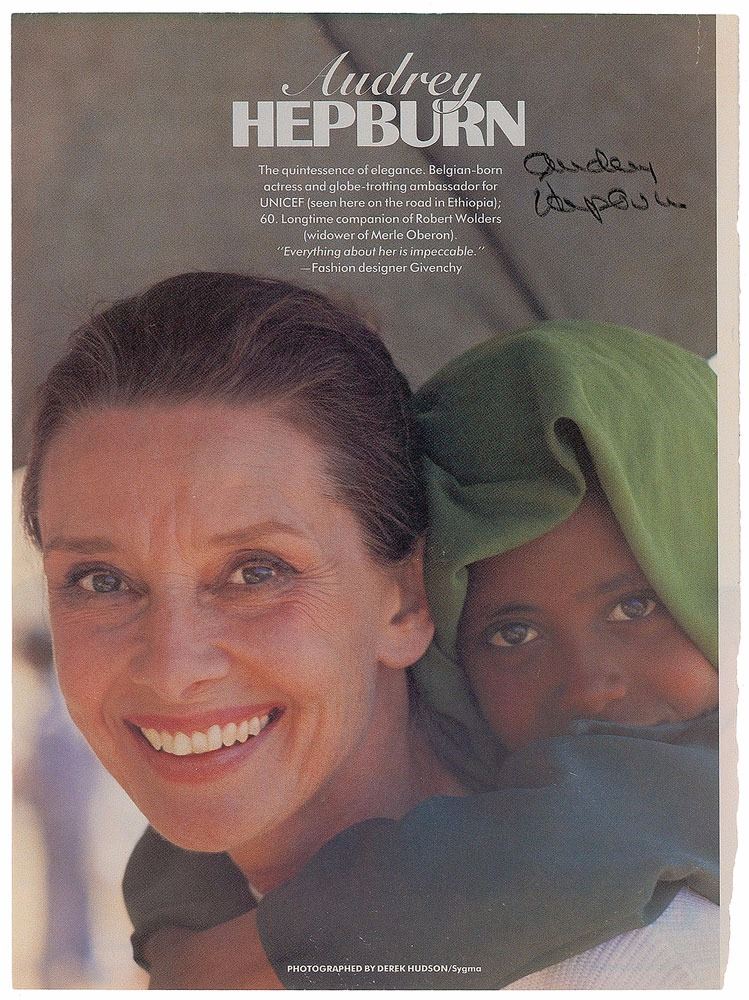 Color 8 x 10.75 magazine photo of Hepburn as a UNICEF ambassador in Ethiopia, signed in black felt tip. In fine condition.