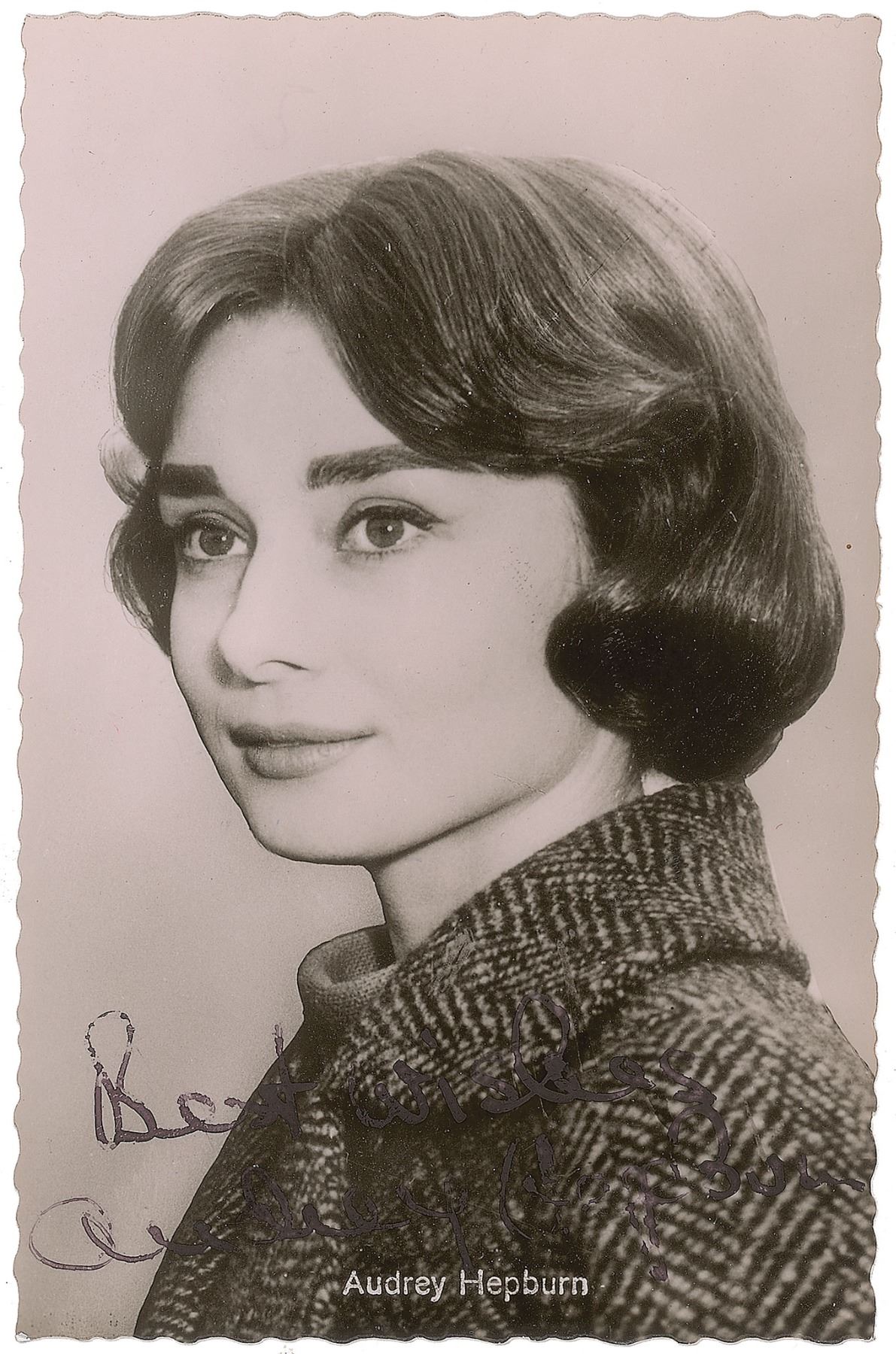 Vintage glossy 3.5 x 5.5 deckle-edge postcard photo of Hepburn in a lovely head-and-shoulders pose, signed in black ink, "Best wishes, Audrey Hepburn." In fine condition, with moderate signature contrast and poor ink adhesion in places. An enchanting early photo of the classic actress.