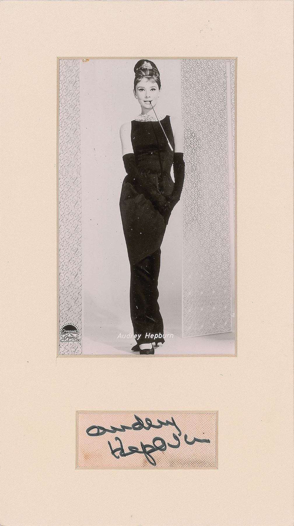 Felt tip signature, "Audrey Hepburn,” on an off-white 2.25 x 1 slip clipped from a glossy photo. Matted with a postcard photo of Hepburn from Breakfast at Tiffany's to an overall size of 5.25 x 9.25. In fine condition, with a brown dot pattern beneath the signature inherent to the photo.
