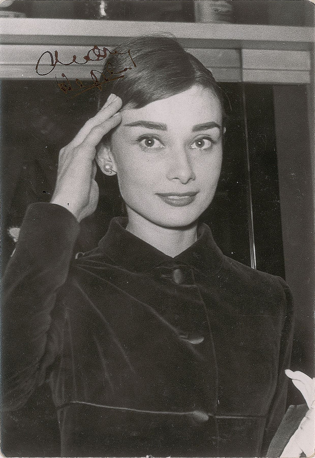 Very attractive vintage semi-glossy 3.5 x 5 half-length photo of Audrey Hepburn smiling as she fixes her hair, signed in fountain pen. In fine condition.