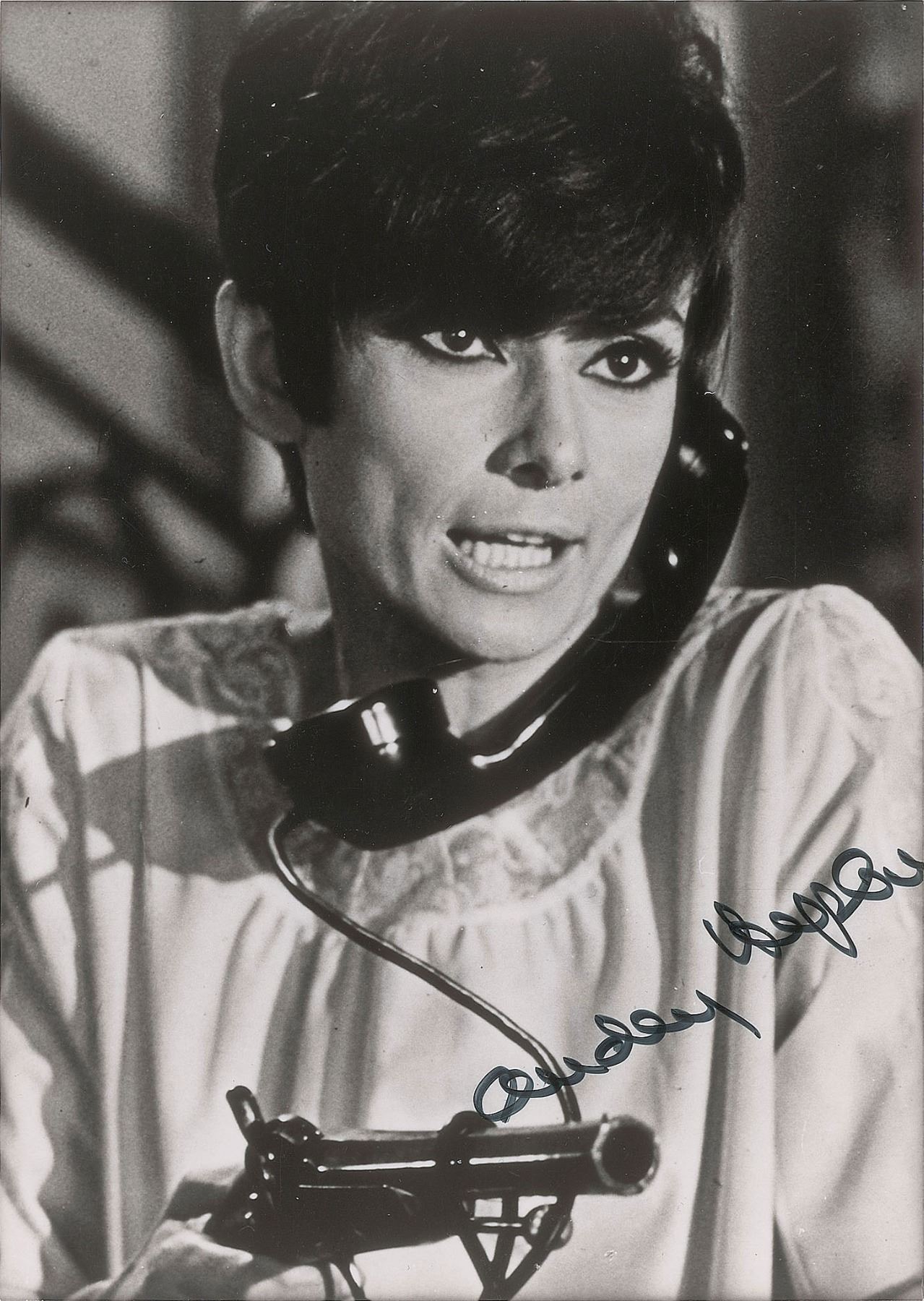 Glossy 5 x 7 photo of Hepburn on the phone as the gun-toting Nicole Bonnet from the 1966 heist comedy How to Steal a Million, signed in black felt tip. Reverse bears German caption text. In very fine condition.
