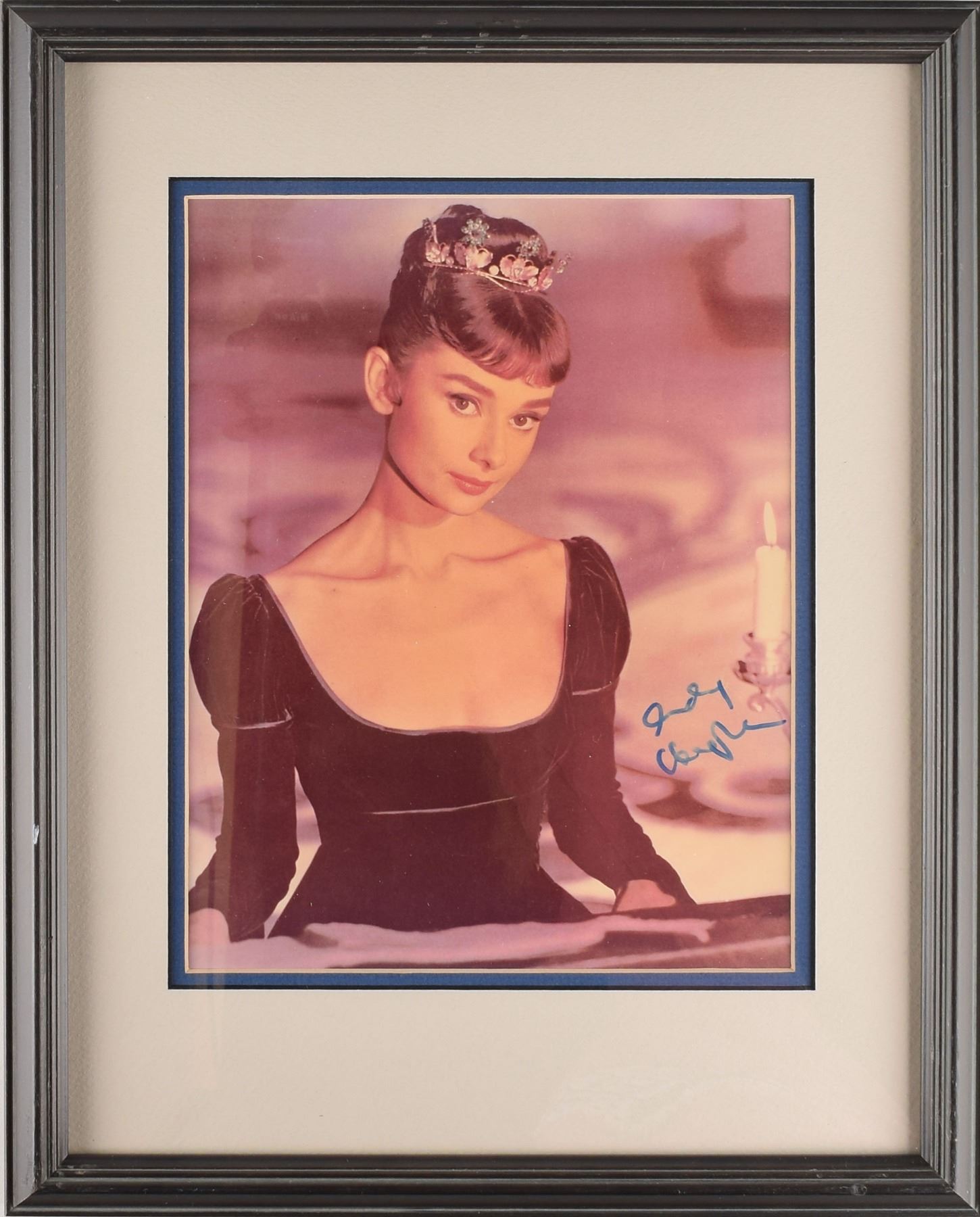 Color glossy 7.5 x 9.5 photo of Hepburn as Natasha Rostova in the 1956 film War and Peace, signed in blue felt tip. Double-matted and framed 12.25 x 15.25. In fine condition.