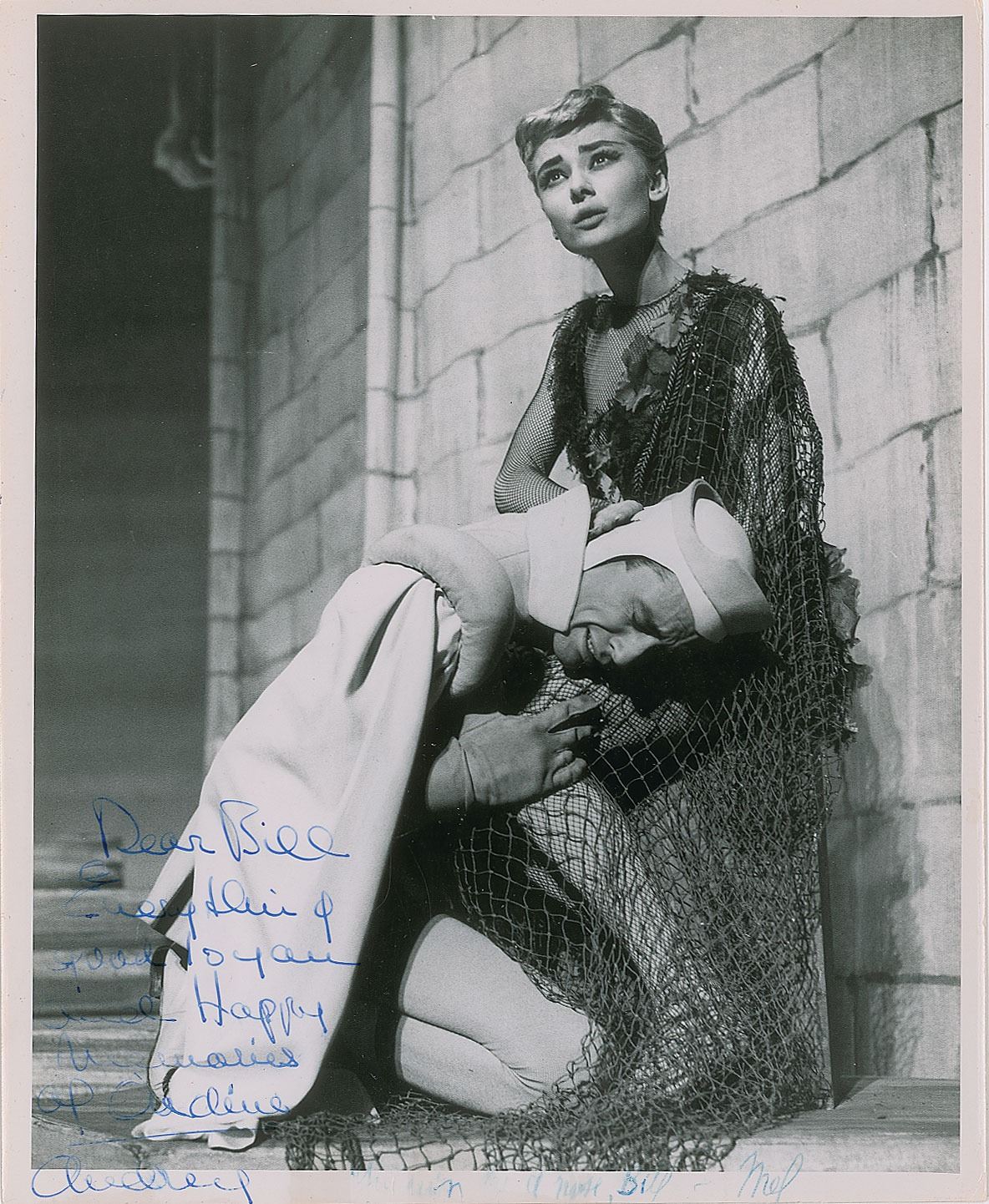 Vintage glossy 8 x 10 photo of Hepburn pictured with husband Mel Ferrer in a production of Ondine, signed and inscribed in fountain pen, "Dear Bill, Everything good to you and happy memories of Ondine, Audrey"; also signed and inscribed in the lower border by Ferrer, whose pen is quite light but still readable. Reverse bears Ondine and Milton Greene stamps. In fine condition.