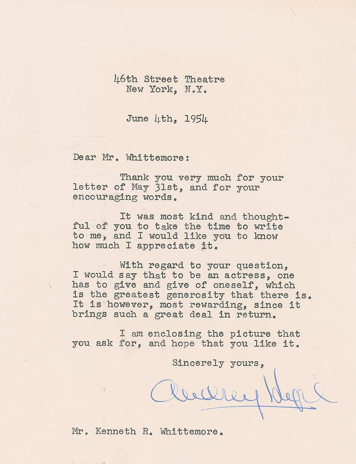 TLS, one page, 6 x 8, June 4, 1954. Letter to Kenneth R. Whittemore, in part: "It was most kind and thoughtful of you to take the time to write to me, and I would like you to know how much I appreciate it. With regard to your question, I would say that to be an actress, one has to give and give of oneself, which is the greatest generosity that there is. It is however, most rewarding, since it brings such a great deal in return." In fine condition.
