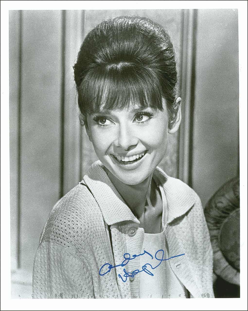 Pretty glossy 8 x 10 photo of Hepburn laughing, signed in blue felt tip. Some scattered light creasing, mainly to background, and a small ding to beginning of signature, otherwise fine condition.