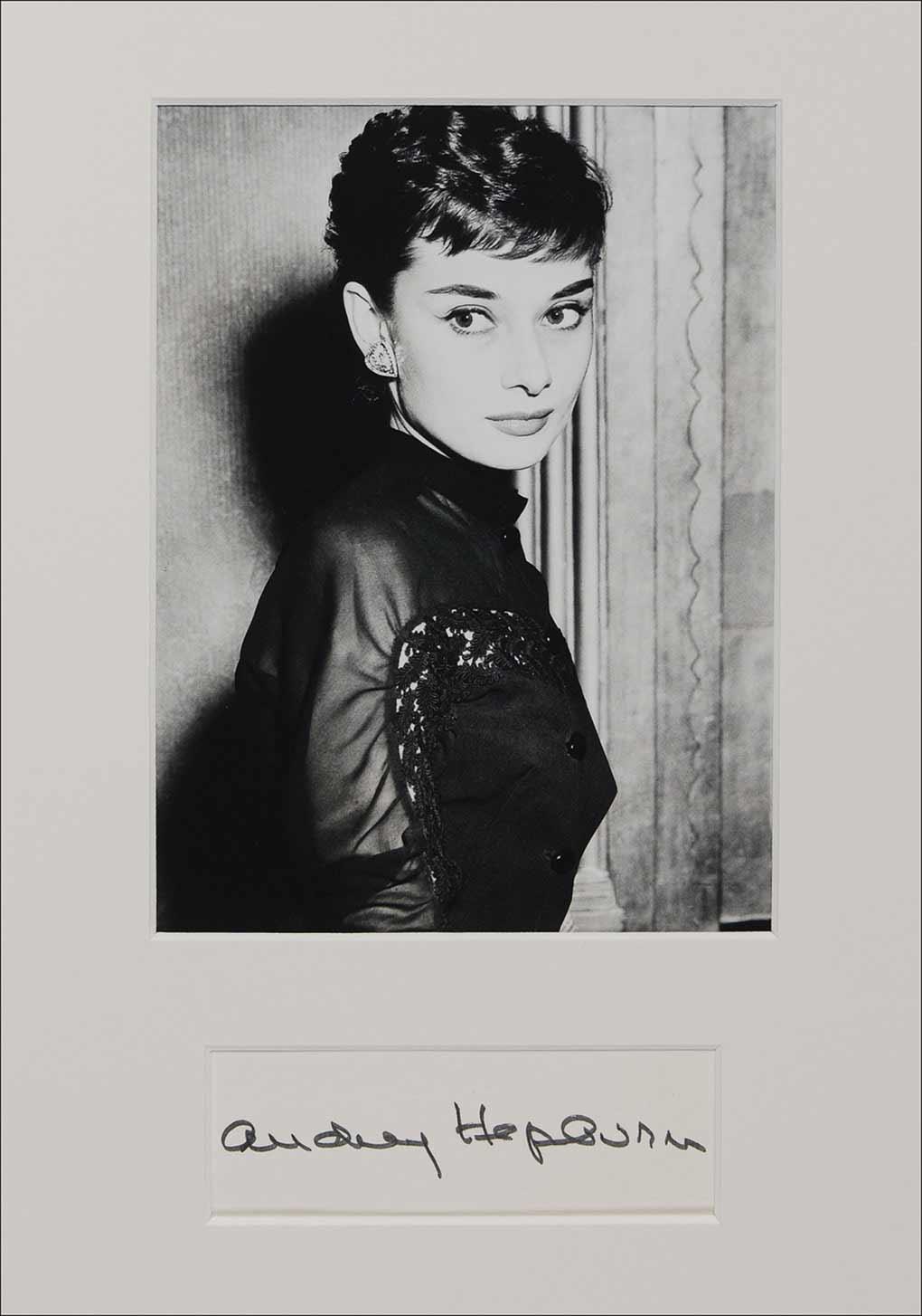 Perfect felt tip signature, “Audrey Hepburn,” on an off-white card. Matted with a lovely portrait of Hepburn, to an overall size of 8.5 x 12. In very fine condition.