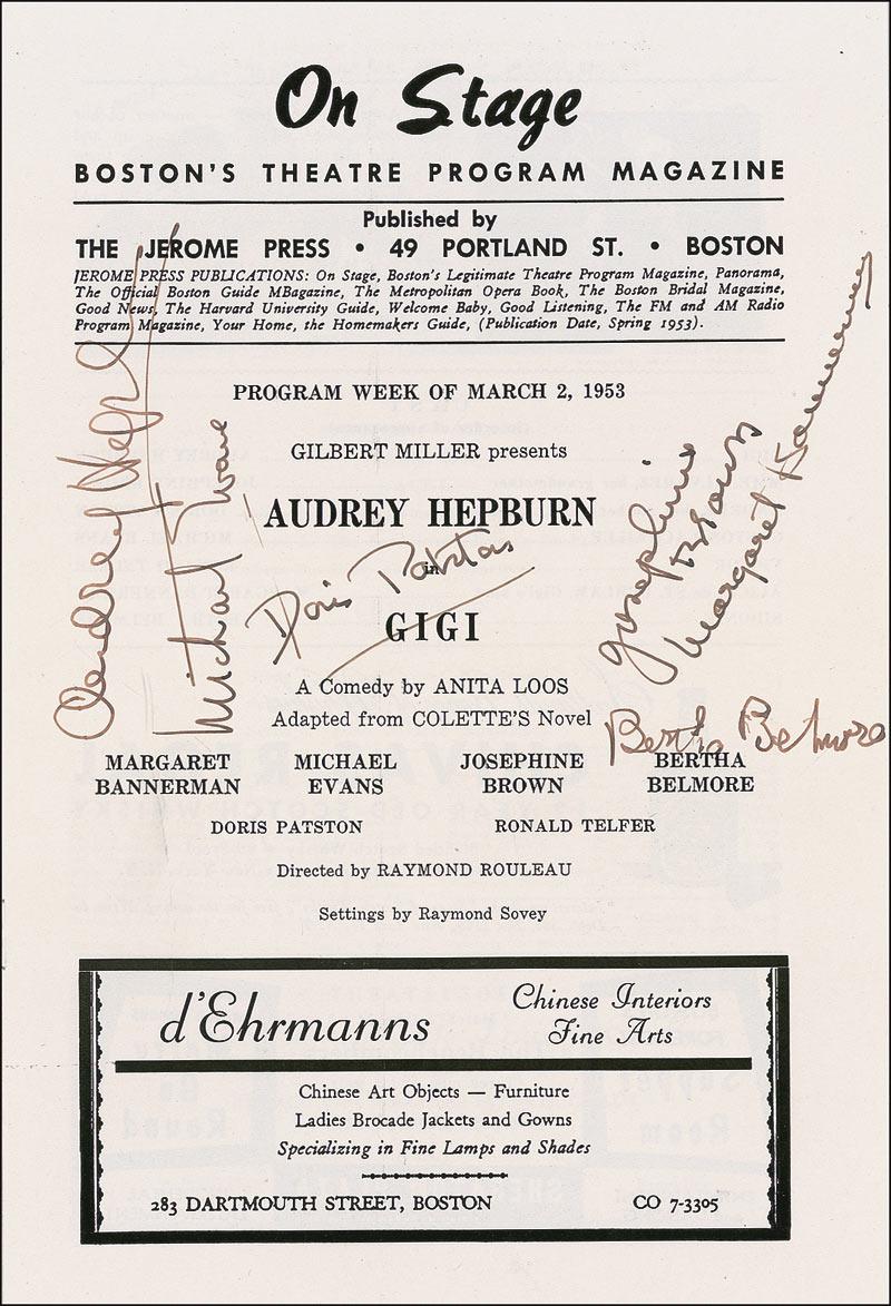 Vintage program from a production of Gigi at the Wilbur Theatre in Boston early in Hepburn’s career, 6.25 x 9.25, signed in fountain pen on the first inside page by Hepburn and four of her fellow cast members. In fine condition, with expected light handling wear. Pre-certified PSA/DNA and RRAuction COA.