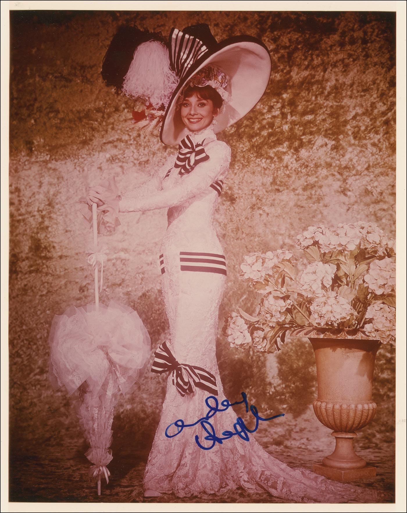 Wonderful color glossy 8 x 10 full-length portrait of Hepburn as the transformed Eliza Doolittle in My Fair Lady, boldly signed in-person in blue felt tip. In very fine condition. A desirable pose, becoming increasingly harder to find. Pre-certified PSA/DNA and RRAuction COA.