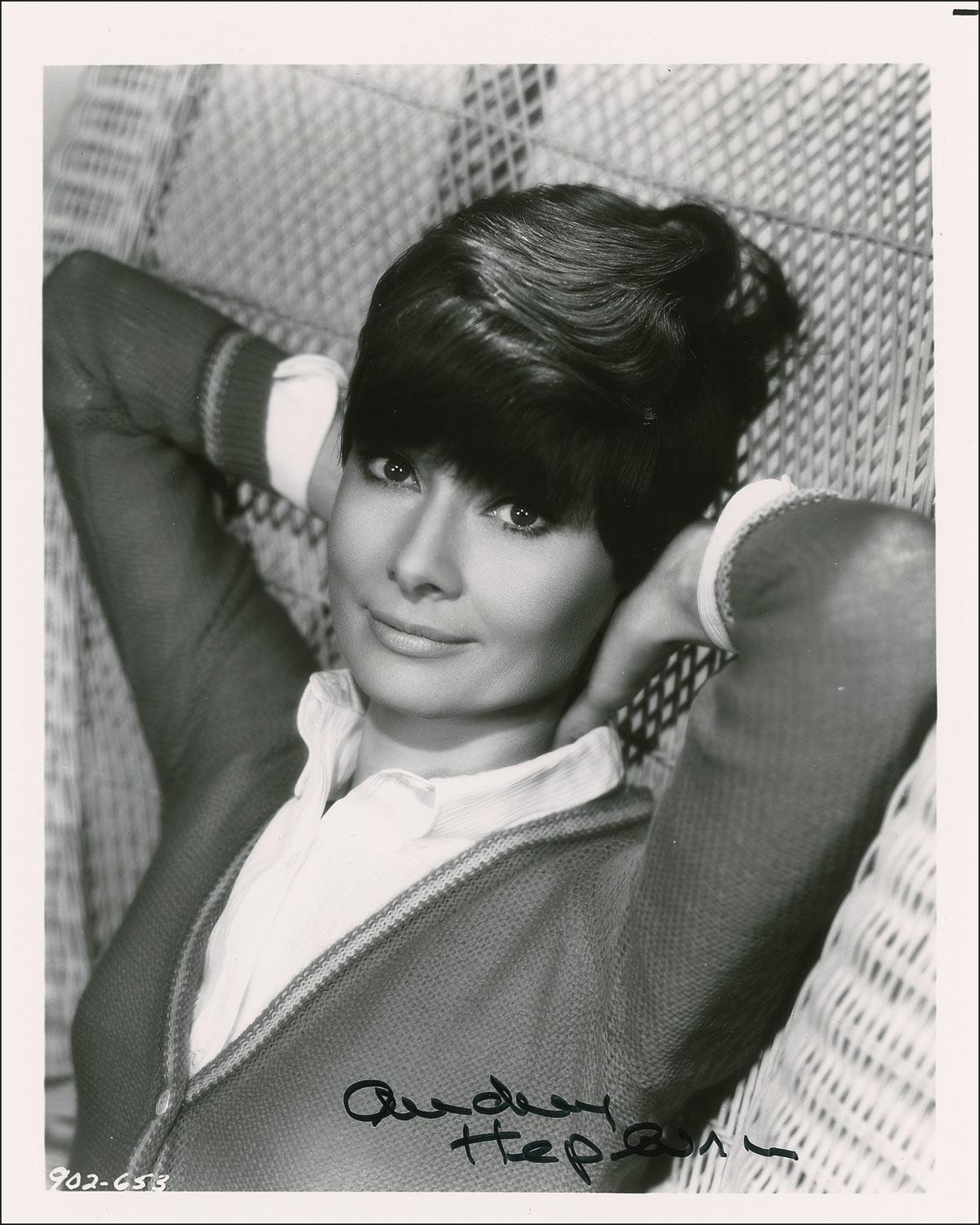 Glossy 8 x 10 photo of Hepburn reclining in a wicker chair (circa Wait Until Dark), signed in black felt tip. In fine condition, with a few trivial surface impressions through a couple letters of signature and bottom edge.