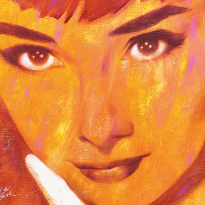 With bright colors and expressive lines, Stephen Fishwick puts a unique spin on pop culture portraits. "Audrey Too" is a limited edition giclee on stretched canvas, numbered and bears the artist's authorized signature. This piece comes gallery wrapped! Includes Certificate of Authenticity! Measures approx. 20" x 16" (image).