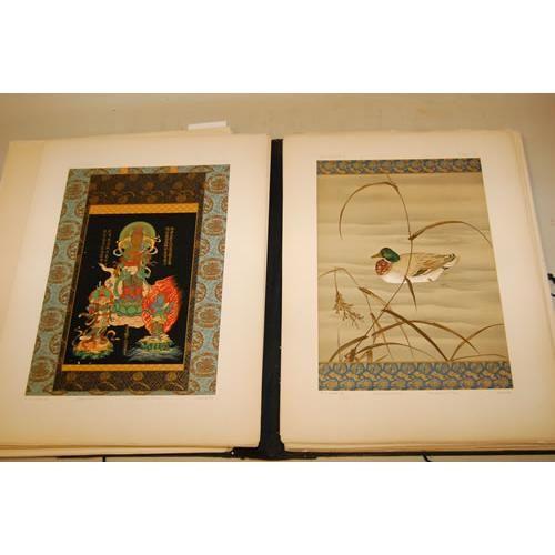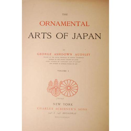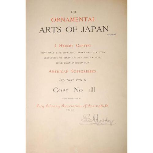Audsley, George Ashdown. The Ornamental Arts of Japan - Subscriber's LIMITED EDITION. New York: Charles Scribner's Sons, Elephant Folio - over 15" - 23" tall. Hard Cover. Ex-Library. Fair to Good Condition. LIMITED #231/500, with Author's signature on the limitation page. 1883-1884. 2 Volumes, in 6 Parts, in 3 portfolios. Lacks some plates. This does have - 84 plates, of which 52 are chromolithographs, many highlighted with gold. Plates on heavy stock, includes text, unbound as issued, in 3 original illustrated portfolios. Subjects include Drawing, Painting, Engraving, Printing, Embroidery, Textile-Fabrics, Lacquer, Incrusted-Work, and Metal-Work. Pages and plates have some edge chips, library marks on back of plates.