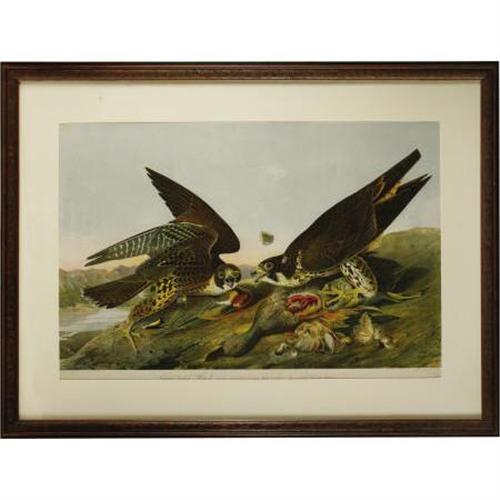 <B>John James Audubon (1785-1851). Great Footed Hawk. Falco Peregrinus. Gmel. Male 1., Female 2. Green-Winged, Teal and Gadwal.</B></I> <BR>Drawn from nature by J.J. Audubon. New York: Bien, 1860. Original chromolithographic plate from the Bien double-elephant Folio edition of John James Audubon's <B><I>The Birds ofAmerica </B></I></B></I>published between 1858 and 1860. Approximate sheet size: 40 x 28 inches. Approximate frame size: 48 x 37 inches. A fine image of two great-footed hawks from scarcest edition of the greatest illustrated natural history work to be produced in America during the nineteenth century.<BR><BR>This print is being offered as a high-quality decorative print and has not been examined out of the frame. (It is matted, framed and glazed.)<BR>The Bien Edition is the one of the earliest and best examples of American chromolithography and can be counted among the finest books ever published using this technology. It was sold by subscription, beginning in 1858, but the project was halted due to the Civil War. Only about 150 of the Audubon plates were completed. (The original double-elephant folio edition boasted 435 plates.) Julius Bien of New York was a German immigrant and an early pioneer in America of chromolithography. A lovely and attractive print in very good condition.<BR><BR><b>Shipping:</b> Framed - with Glass, Large (<a target="_blank" href="http://www.heritageauctions.com/common/shipping.php">view shipping information</a>)