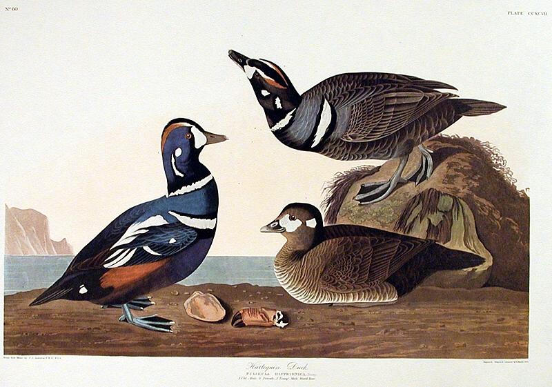 ''Harlequin Duck'' #297 from the Amsterdam edition of Audubon's ''Birds of America,'' published in 1972. This full-size edition faithfully reproduces the original Havell edition. The brilliantly-colored ducks are on shore and hover around a segment of crab leg. One of the ducks stands on a rock overhead with his head craned. All 435 full-size color plates from the book were published and limited to only 250 numbered sets. Size: 39.5'' x 26.5''; 12-color offset lithography. Image contains slight horizontal wrinkling and slight chips to the edges, otherwise excellent condition.