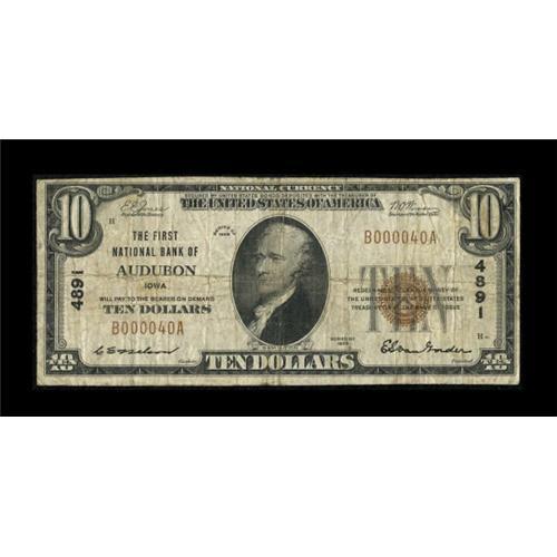 <B>Audubon, IA</B></I> - $10 1929 Ty. 1 <B>The First NB</B></I> Ch. # 4891<BR> This is an evenly circulated <B>Very Good+</B></I>. This was the only issuing bank in town which closed its doors in 1933 after issuing just the Type 1 $10 and $20 denominations in the 1929 series. <BR><BR><b>Shipping:</b> Coins & Currency (<a target="_blank" href="http://www.heritageauctions.com/common/shipping.php">view shipping information</a>)