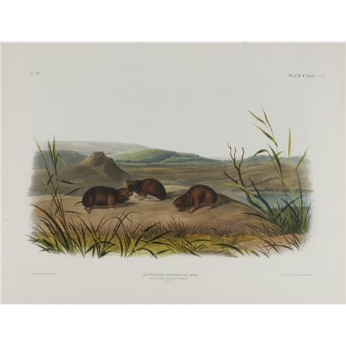 <B>Audubon Imperial Quadruped Print: <I>Arvicola Borealis;</B></I> Northern Meadow-Mouse.</B></I> This lot features plate CXXIV, the Northern Meadow-Mouse. The mice are shown sitting on the bank of a stream, surrounded by some vegetation. This mouse is native to the Northern grasslands of America and Canada; they have a short stout body and short tail. They almost resemble small beavers in this print. This large print is impressive in that every detail on the mouse is carefully drawn and depicted. All three mice are shown at natural size.