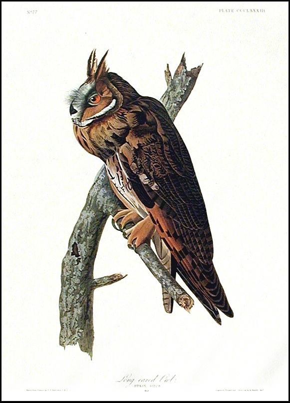 John James Audubon's ''Long-Eared Owl'' #383 from the Amsterdam edition of Audubon's ''Birds of America,'' published in 1972. The book made Audubon a premiere wildlife artist who set a standard that persists even today and made him the measure of all bird artists. All 435 full-size color plates were published and limited to only 250 numbered sets. The copy used to reproduce these prints were taken from the Telyer's Museum in Holland. Long-eared owl measures 26.5'' x 39.5'', with 12-color offset lithography. Image contains slight horizontal wrinkling and slight chips to the edges, otherwise excellent condition.