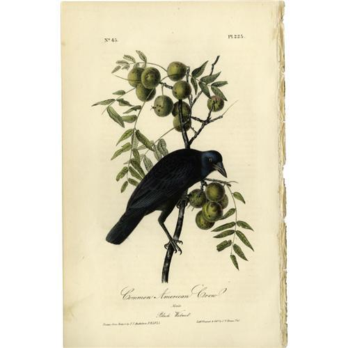<B>Common American Crow Audubon Royal Octavo Print.</B></I> Plate number 225 headlines the American Crow. The male of the species is shown perched atop the Black Walnut tree. The character of the Audubon prints is enhanced by the addition of vegetation to the drawings. By depicting the birds in their natural habitats, he was able to transmogrify the birds into living creatures on paper. The two pages of text that piggyback this print contain information about the species. <BR><BR><B>Important notice