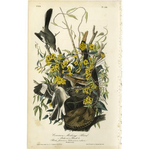 <B> Common Mockingbird Audubon Royal Octavo Print. </B></I> Plate number 138 headlines the Mockingbird! Two males and one female are drawn defending their nest from an invading rattlesnake. The nest sits in a Florida Jessamine tree. This is one of the more animated and intense prints in the series. The snake is in mid-strike as he lunges at the female mockingbird. The males look on and prepare to defend their home. Three pages of text piggyback this print, and they contain information about the mockingbird. A striking print, no pun intended! <BR><BR><B>Important notice