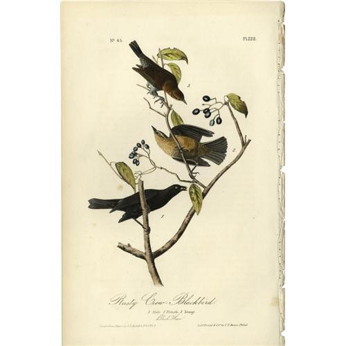 <B>Rusty Crow-Blackbird Audubon Royal Octavo Print.</B></I> Plate number 222 shows the male, female, and offspring of the Rusty Crow all perched on the branches of the Black Haw tree. Two pages of text are included with this print. The eggs of the Rusty Crow are light blue with streaks of dark brown or black, and they come in batches of four or five! <BR><BR><B>Important notice