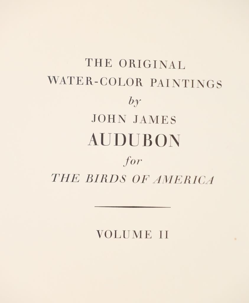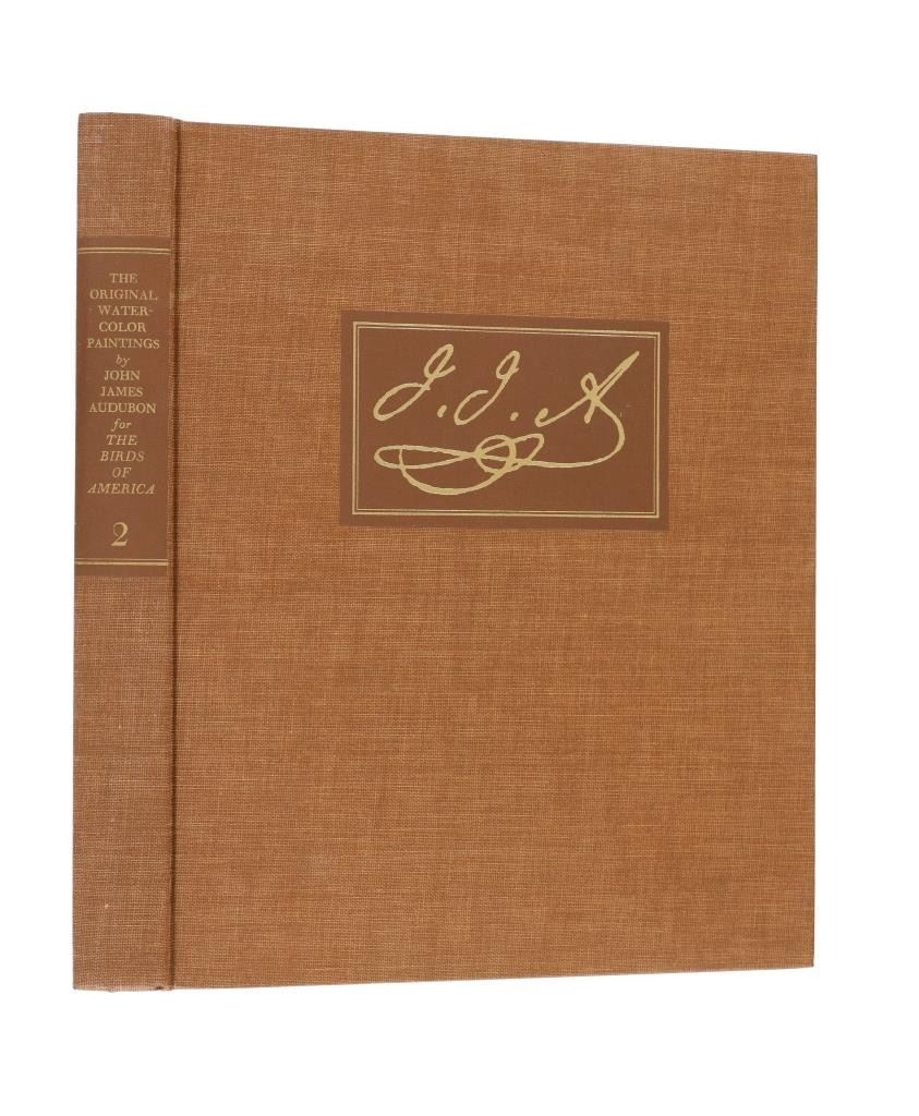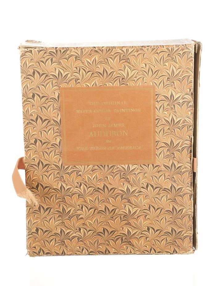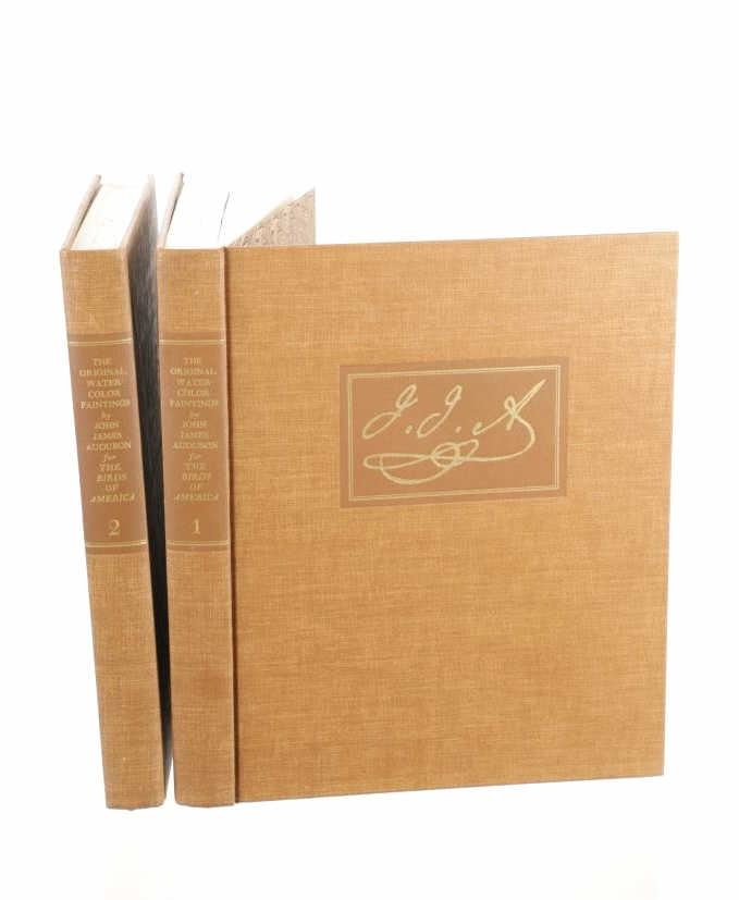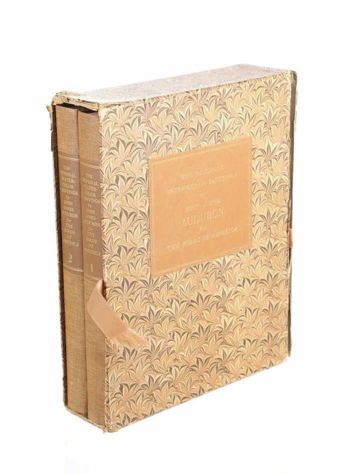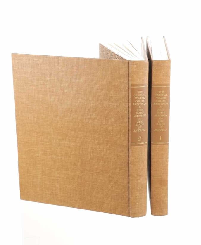 For your consideration this lot contains the First Edition of "The Original Water-Color Paintings by John James Audubon for The Birds Of America", American Heritage Publishing Co., Inc., New York, 1966. Two (2) volumes in the publisher's original marbled paper covered slipcase. Illustrated with 431 full-page, full-color, plates, including full-page color frontispiece portrait of Audubon by John Syme. John James Audubon's Birds of America is a portal into the natural world. Issued serially in installments over a period of 12 years, Birds of America stands not only as one of the most beautiful books ever created, but also as an important contribution to the ornithological field: of the 435 birds illustrated in the work's four volumes, 25 were previously undocumented, and six are now extinct. John James Audubon (1785-1851) was a self-taught ornithologist, naturalist and artist. He was notable for his extensive studies documenting all types of American birds and for his detailed illustrations, which depicted the birds in their natural habitats. The Birds of America, Audubon's collection of lifelike drawings, was a feat of artistry, technical skill and determination, and is one of the finest ornithological works ever completed. The volumes are in very nice, pristine condition, unmarked, unread, tight, square, and clean. Brown cloth bound gold gilt hardcovers, marbled endpapers. The marbled paper covered gold gilt slipcase shows wear at the edges and spine split at boards. Intact pages. Slipcase with volumes measures 11.25"W x 14"L x 3"D, weight 14lbs.