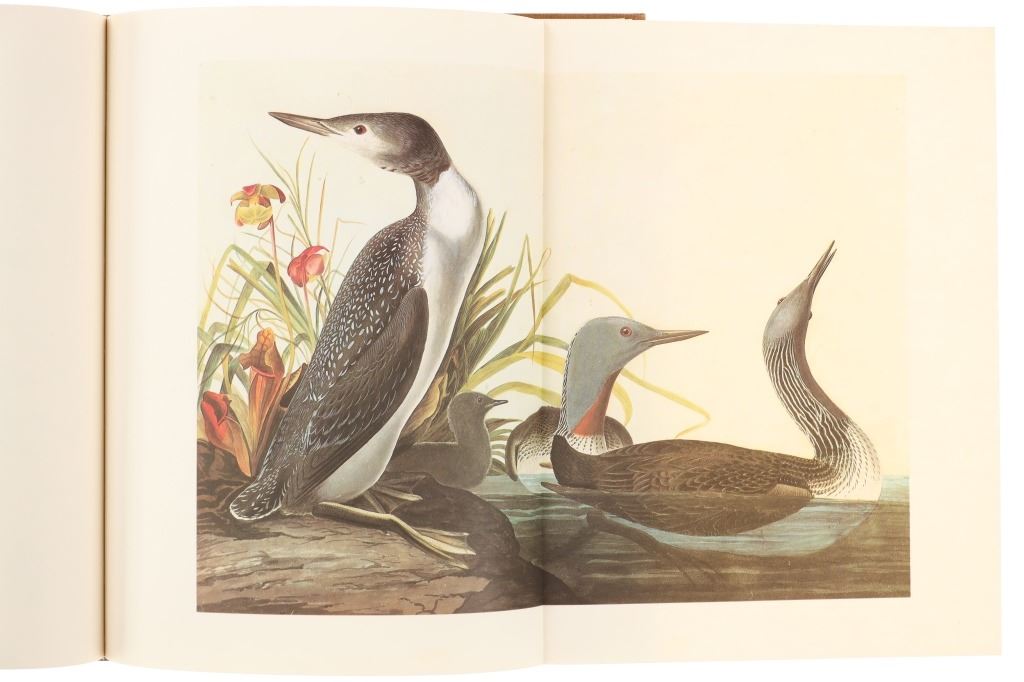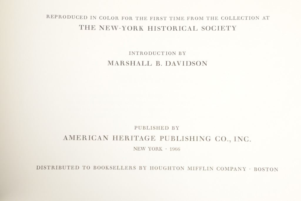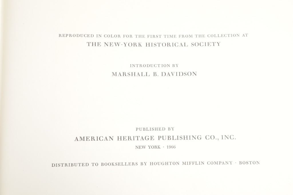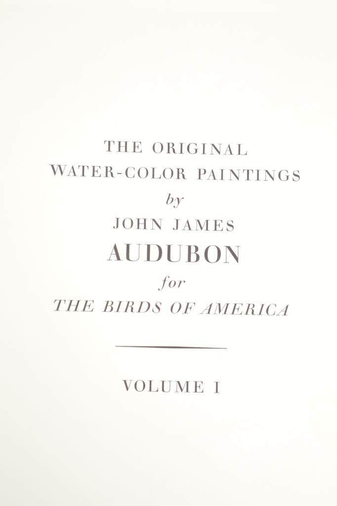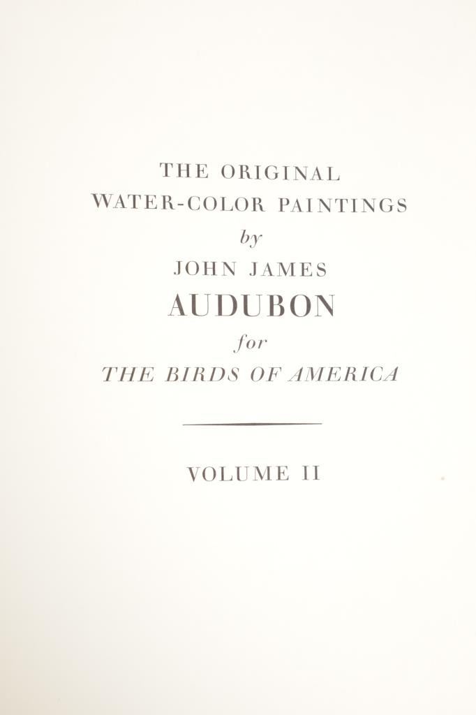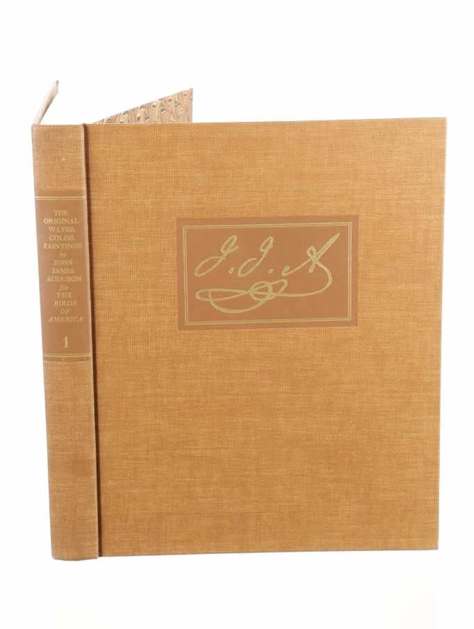For your consideration this lot contains the First Edition of "The Original Water-Color Paintings by John James Audubon for The Birds Of America", American Heritage Publishing Co., Inc., New York, 1966. Two (2) volumes in the publisher's original marbled paper covered slipcase. Illustrated with 431 full-page, full-color, plates, including full-page color frontispiece portrait of Audubon by John Syme. John James Audubon's Birds of America is a portal into the natural world. Issued serially in installments over a period of 12 years, Birds of America stands not only as one of the most beautiful books ever created, but also as an important contribution to the ornithological field: of the 435 birds illustrated in the work's four volumes, 25 were previously undocumented, and six are now extinct. John James Audubon (1785-1851) was a self-taught ornithologist, naturalist and artist. He was notable for his extensive studies documenting all types of American birds and for his detailed illustrations, which depicted the birds in their natural habitats. The Birds of America, Audubon's collection of lifelike drawings, was a feat of artistry, technical skill and determination, and is one of the finest ornithological works ever completed. The volumes are in very nice, pristine condition, unmarked, unread, tight, square, and clean. Brown cloth bound gold gilt hardcovers, marbled endpapers. The marbled paper covered gold gilt slipcase shows wear at the edges and spine split at boards. Intact pages. Slipcase with volumes measures 11.25"W x 14"L x 3"D, weight 14lbs.