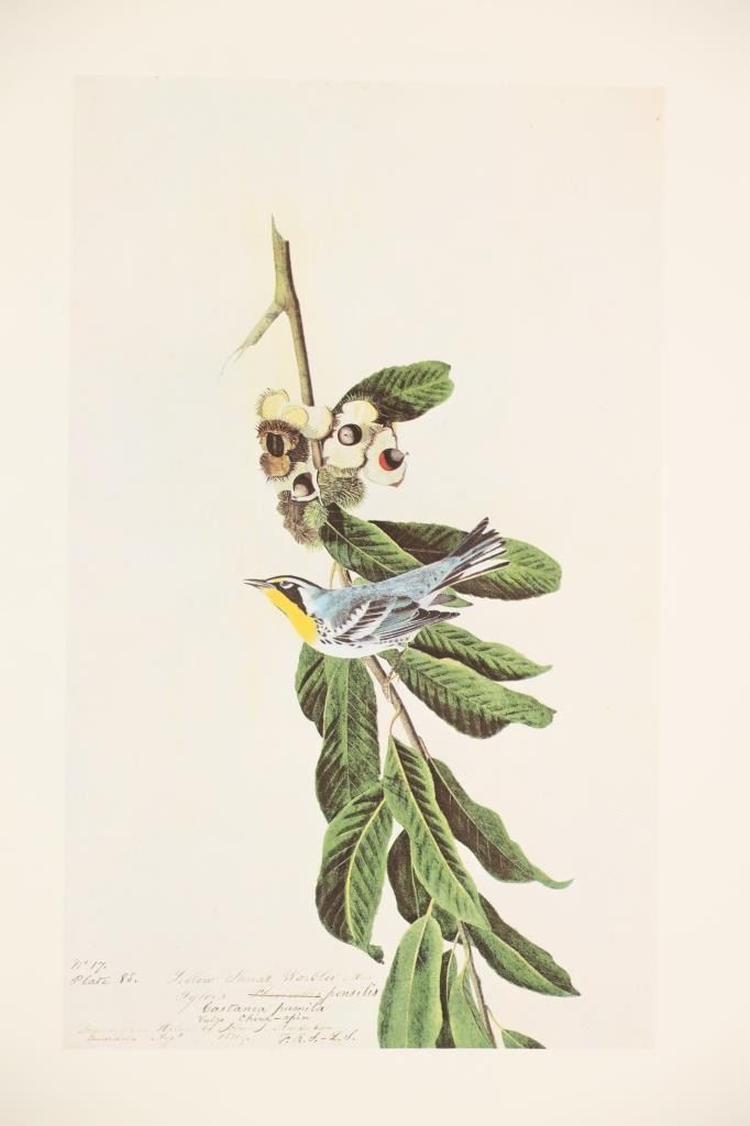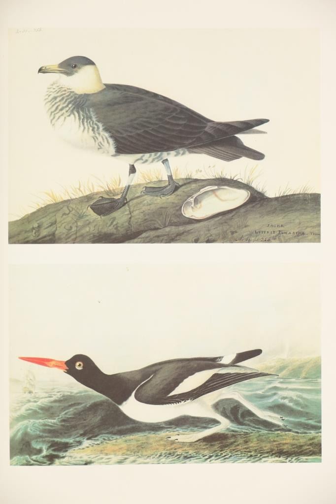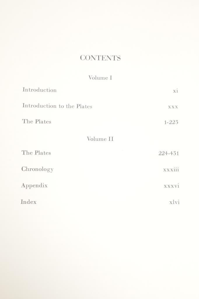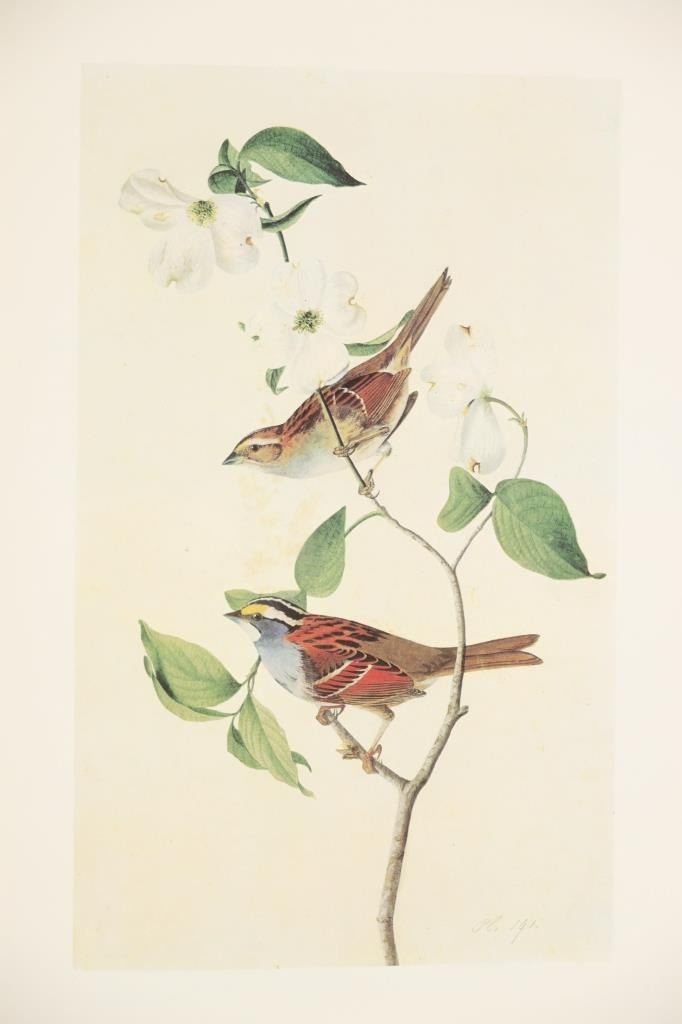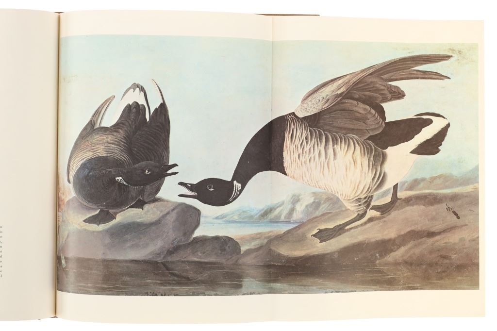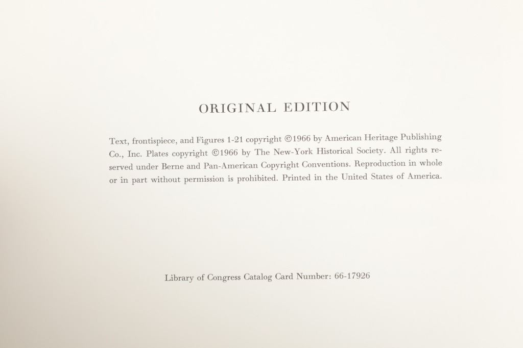 For your consideration this lot contains the First Edition of "The Original Water-Color Paintings by John James Audubon for The Birds Of America", American Heritage Publishing Co., Inc., New York, 1966. Two (2) volumes in the publisher's original marbled paper covered slipcase. Illustrated with 431 full-page, full-color, plates, including full-page color frontispiece portrait of Audubon by John Syme. John James Audubon's Birds of America is a portal into the natural world. Issued serially in installments over a period of 12 years, Birds of America stands not only as one of the most beautiful books ever created, but also as an important contribution to the ornithological field: of the 435 birds illustrated in the work's four volumes, 25 were previously undocumented, and six are now extinct. John James Audubon (1785-1851) was a self-taught ornithologist, naturalist and artist. He was notable for his extensive studies documenting all types of American birds and for his detailed illustrations, which depicted the birds in their natural habitats. The Birds of America, Audubon's collection of lifelike drawings, was a feat of artistry, technical skill and determination, and is one of the finest ornithological works ever completed. The volumes are in very nice, pristine condition, unmarked, unread, tight, square, and clean. Brown cloth bound gold gilt hardcovers, marbled endpapers. The marbled paper covered gold gilt slipcase shows wear at the edges and spine split at boards. Intact pages. Slipcase with volumes measures 11.25"W x 14"L x 3"D, weight 14lbs.