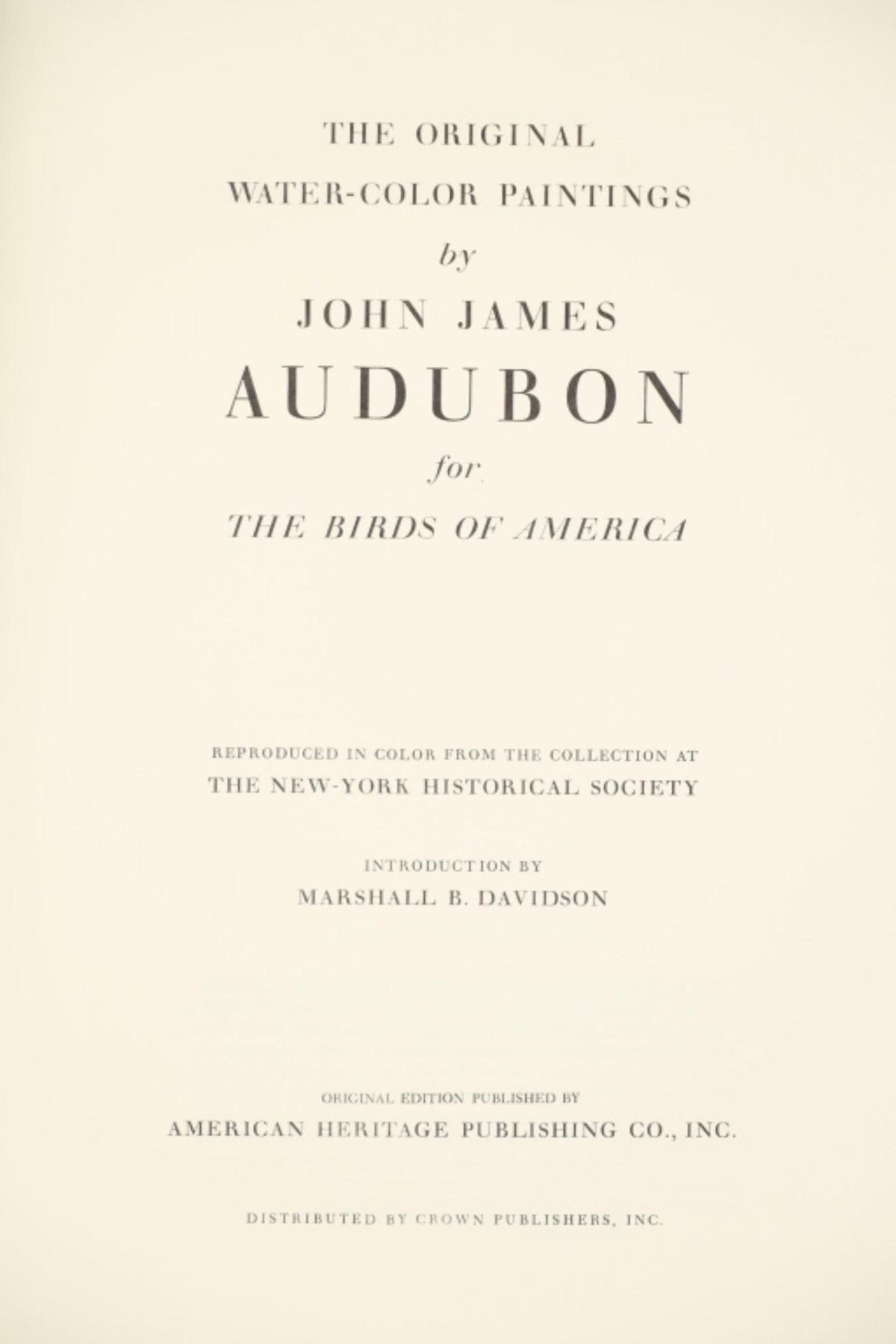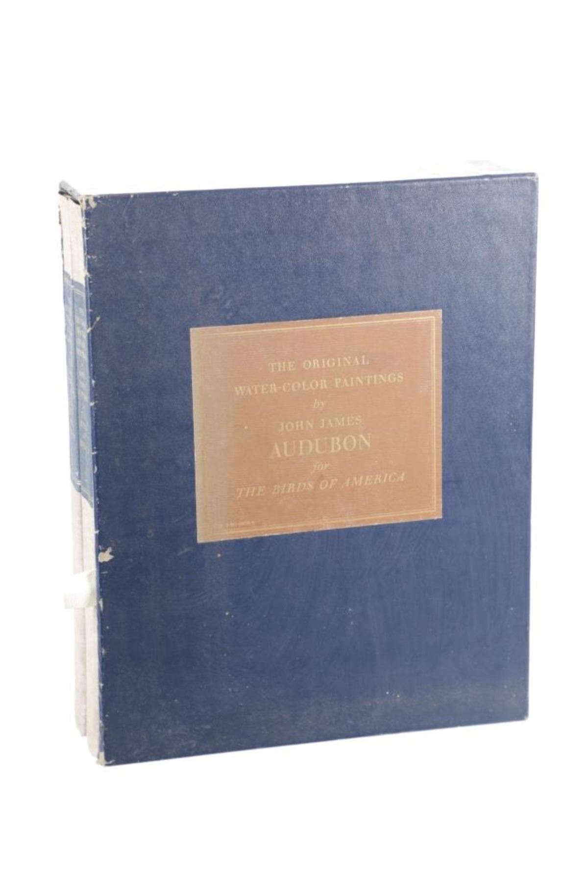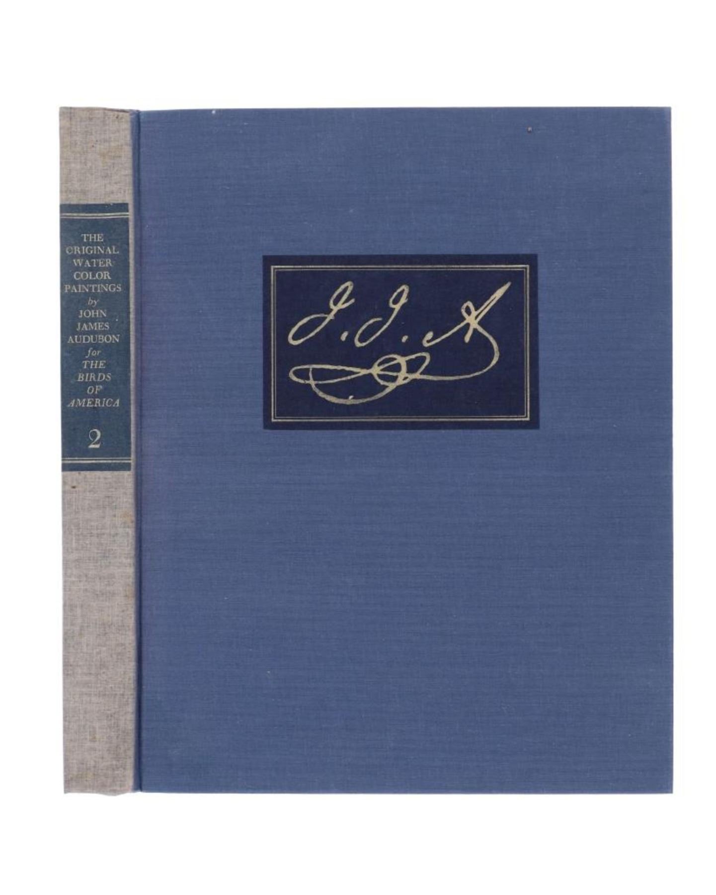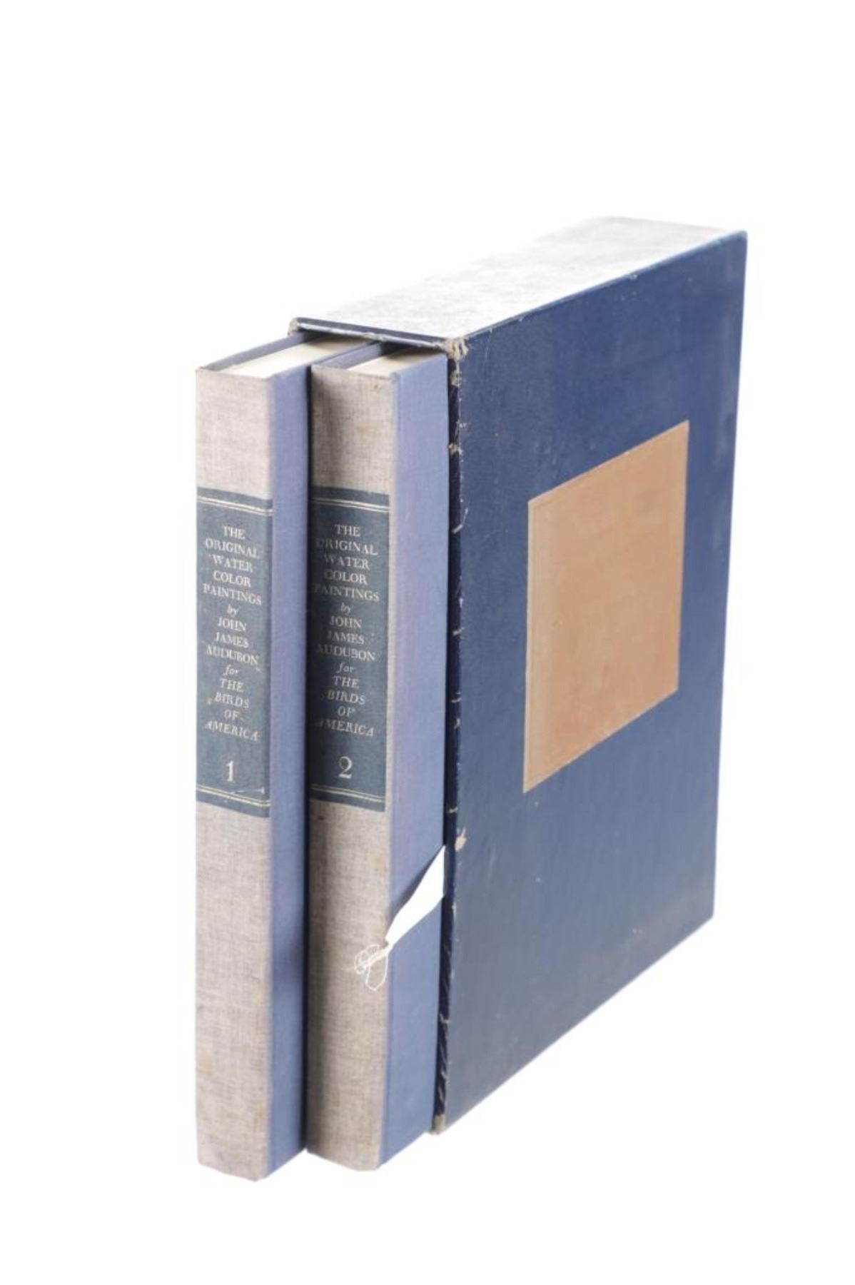 This lot contains the First Edition of "The Original Water-Color Paintings by John James Audubon for The Birds Of America," American Heritage Publishing Co., Inc., New York, 1966. Two (2) volumes in the publisher's original marbled paper covered slipcase. Illustrated with 431 full-page, full-color, plates, including full-page color frontispiece portrait of Audubon by John Syme. John James Audubon's Birds of America is a portal into the natural world. Issued serially in installments over a period of 12 years, Birds of America stands not only as one of the most beautiful books ever created, but also as an important contribution to the ornithological field: of the 435 birds illustrated in the work's four volumes, 25 were previously undocumented, and six are now extinct. John James Audubon (1785-1851) was a self-taught ornithologist, naturalist and artist. He was notable for his extensive studies documenting all types of American birds and for his detailed illustrations, which depicted the birds in their natural habitats. The Birds of America, Audubon's collection of lifelike drawings, was a feat of artistry, technical skill and determination, and is one of the finest ornithological works ever completed. The volumes are in very nice, pristine condition, unmarked, unread, tight, square, and clean. Blue cloth bound gold gilt hardcovers. Blue cloth covered gold gilt slipcase shows wear at the edges and spine. Intact pages. Slipcase with volumes measures 14"L x 11.25"W x 3"D, weight 14lbs.