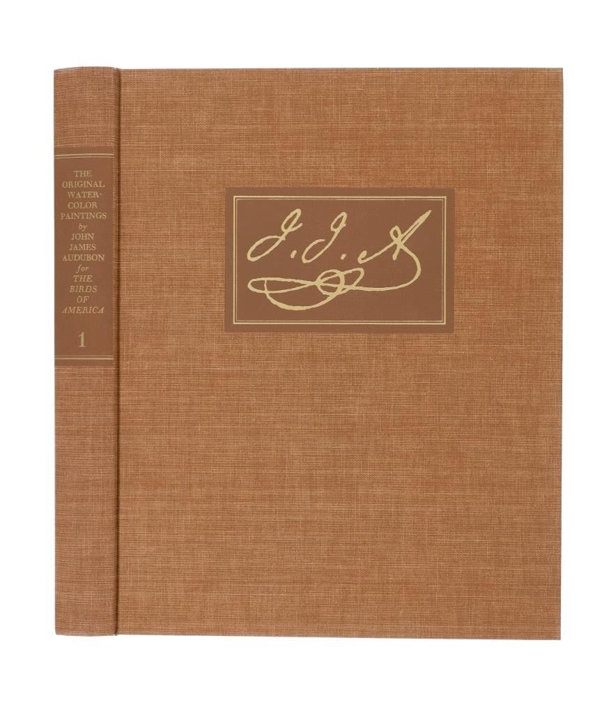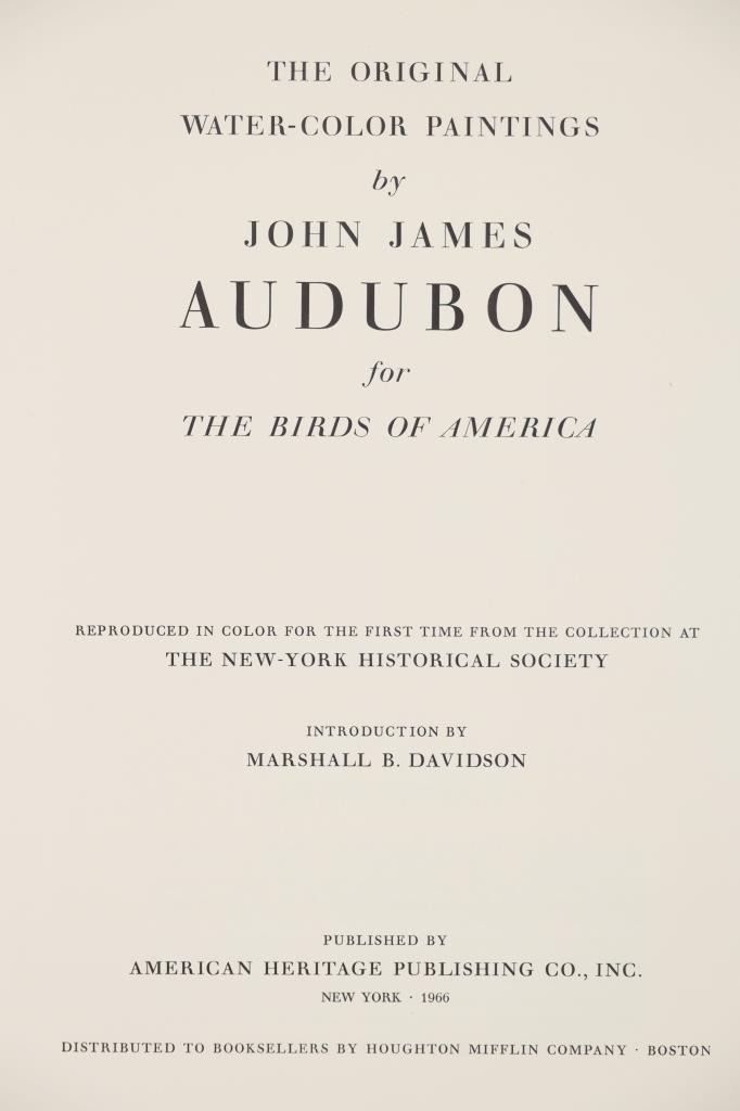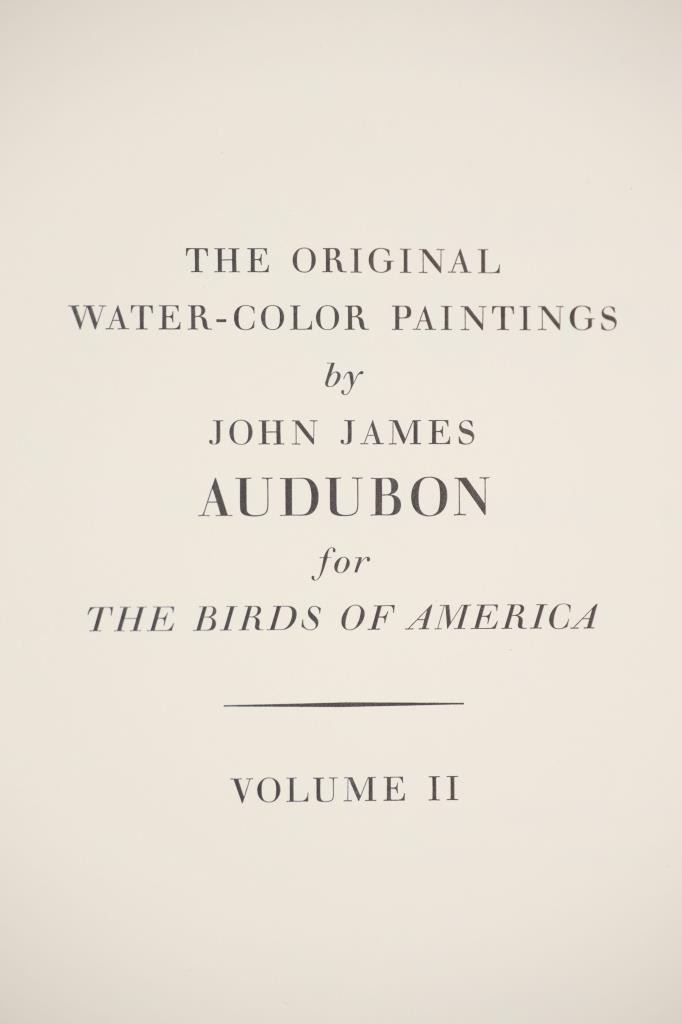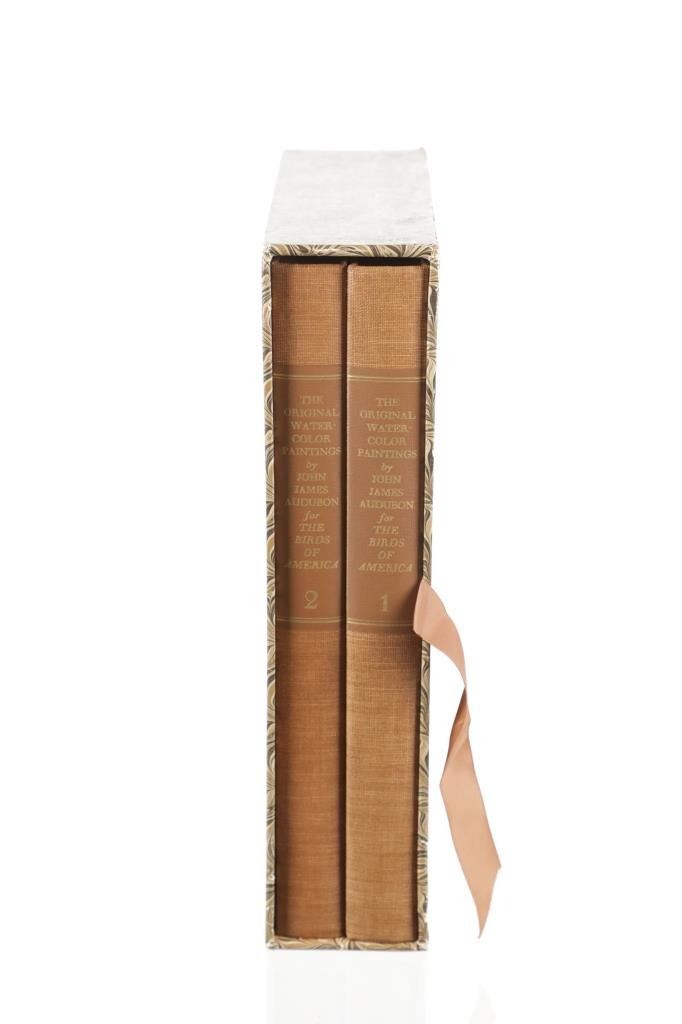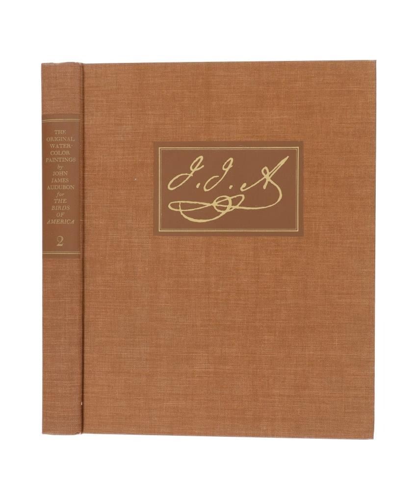 For your consideration this lot contains the First Edition of "The Original Water-Color Paintings by John James Audubon for The Birds Of America", American Heritage Publishing Co., Inc., New York, 1966. Two (2) volumes in the publisher's original marbled paper covered slipcase. Illustrated with 431 full-page, full-color, plates, including full-page color frontispiece portrait of Audubon by John Syme. John James Audubon's Birds of America is a portal into the natural world. Issued serially in installments over a period of 12 years, Birds of America stands not only as one of the most beautiful books ever created, but also as an important contribution to the ornithological field: of the 435 birds illustrated in the work's four volumes, 25 were previously undocumented, and six are now extinct. John James Audubon (1785-1851) was a self-taught ornithologist, naturalist and artist. He was notable for his extensive studies documenting all types of American birds and for his detailed illustrations, which depicted the birds in their natural habitats. The Birds of America, Audubon's collection of lifelike drawings, was a feat of artistry, technical skill and determination, and is one of the finest ornithological works ever completed. The volumes are in very nice, pristine condition, unmarked, unread, tight, square, and clean. Brown cloth bound gold gilt hardcovers, marbled endpapers. The marbled paper covered gold gilt slipcase shows wear at the edges and spine split at boards. Intact pages. Slipcase with volumes measures 11.25"W x 14"L x 3"D; weight 14lbs.*