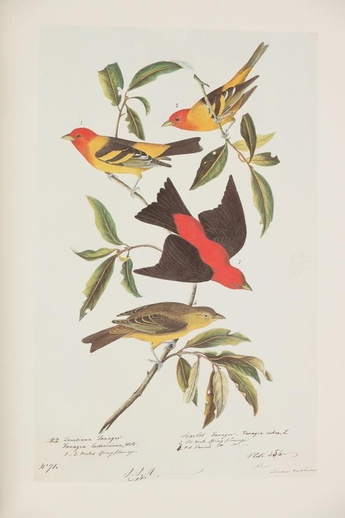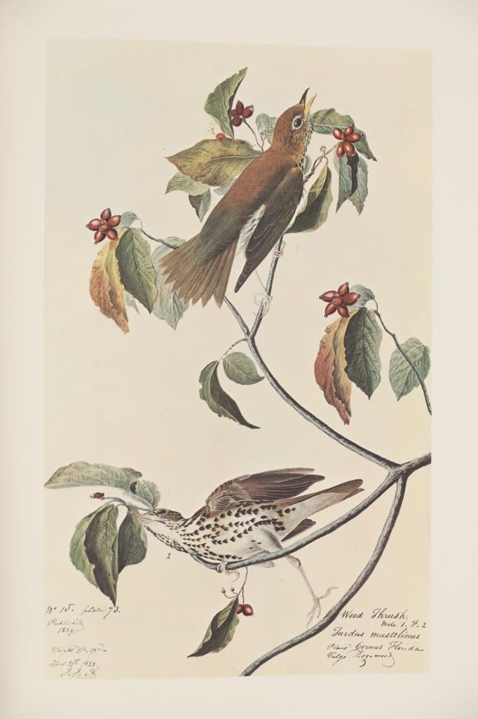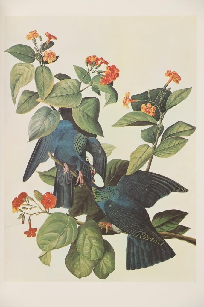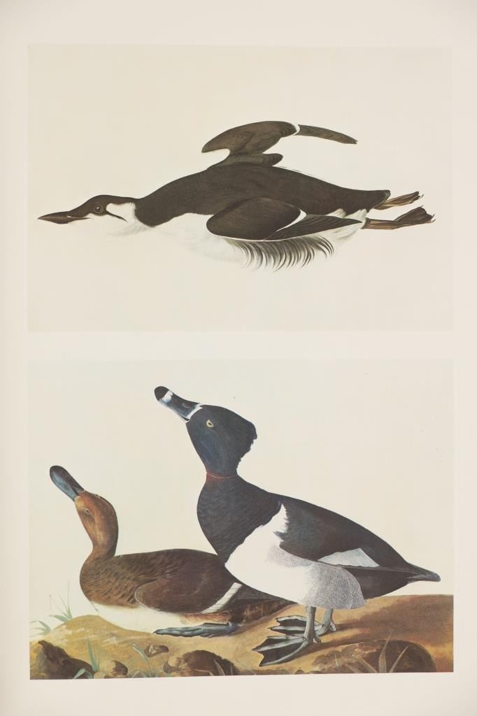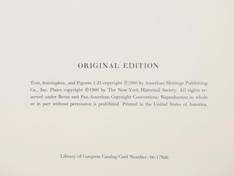 For your consideration this lot contains the First Edition of "The Original Water-Color Paintings by John James Audubon for The Birds Of America", American Heritage Publishing Co., Inc., New York, 1966. Two (2) volumes in the publisher's original marbled paper covered slipcase. Illustrated with 431 full-page, full-color, plates, including full-page color frontispiece portrait of Audubon by John Syme. John James Audubon's Birds of America is a portal into the natural world. Issued serially in installments over a period of 12 years, Birds of America stands not only as one of the most beautiful books ever created, but also as an important contribution to the ornithological field: of the 435 birds illustrated in the work's four volumes, 25 were previously undocumented, and six are now extinct. John James Audubon (1785-1851) was a self-taught ornithologist, naturalist and artist. He was notable for his extensive studies documenting all types of American birds and for his detailed illustrations, which depicted the birds in their natural habitats. The Birds of America, Audubon's collection of lifelike drawings, was a feat of artistry, technical skill and determination, and is one of the finest ornithological works ever completed. The volumes are in very nice, pristine condition, unmarked, unread, tight, square, and clean. Brown cloth bound gold gilt hardcovers, marbled endpapers. The marbled paper covered gold gilt slipcase shows wear at the edges and spine split at boards. Intact pages. Slipcase with volumes measures 11.25"W x 14"L x 3"D; weight 14lbs.*