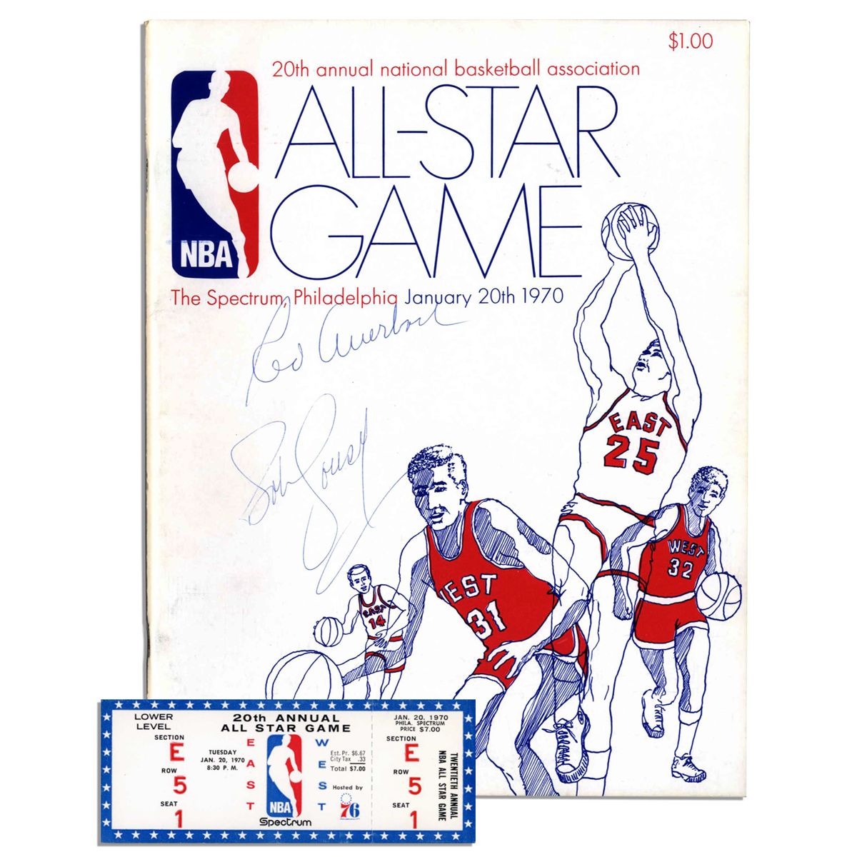 Arnold ''Red'' Auerbach and Bob Cousy signed NBA All-Star game program and unused ticket from 1970. Signed ''Red Auerbach'' and ''Bob Cousy'' in blue ballpoint pen on the program's front cover by the Celtics coach and basketball Hall of Fame point guard, respectively. Lot also includes an unused ticket to the 20th Annual NBA All-Star Game at the Philadelphia Spectrum, dated 20 January 1970. The Spectrum stadium was razed in 2010. With PSA/DNA LOA. Both items in very good condition.