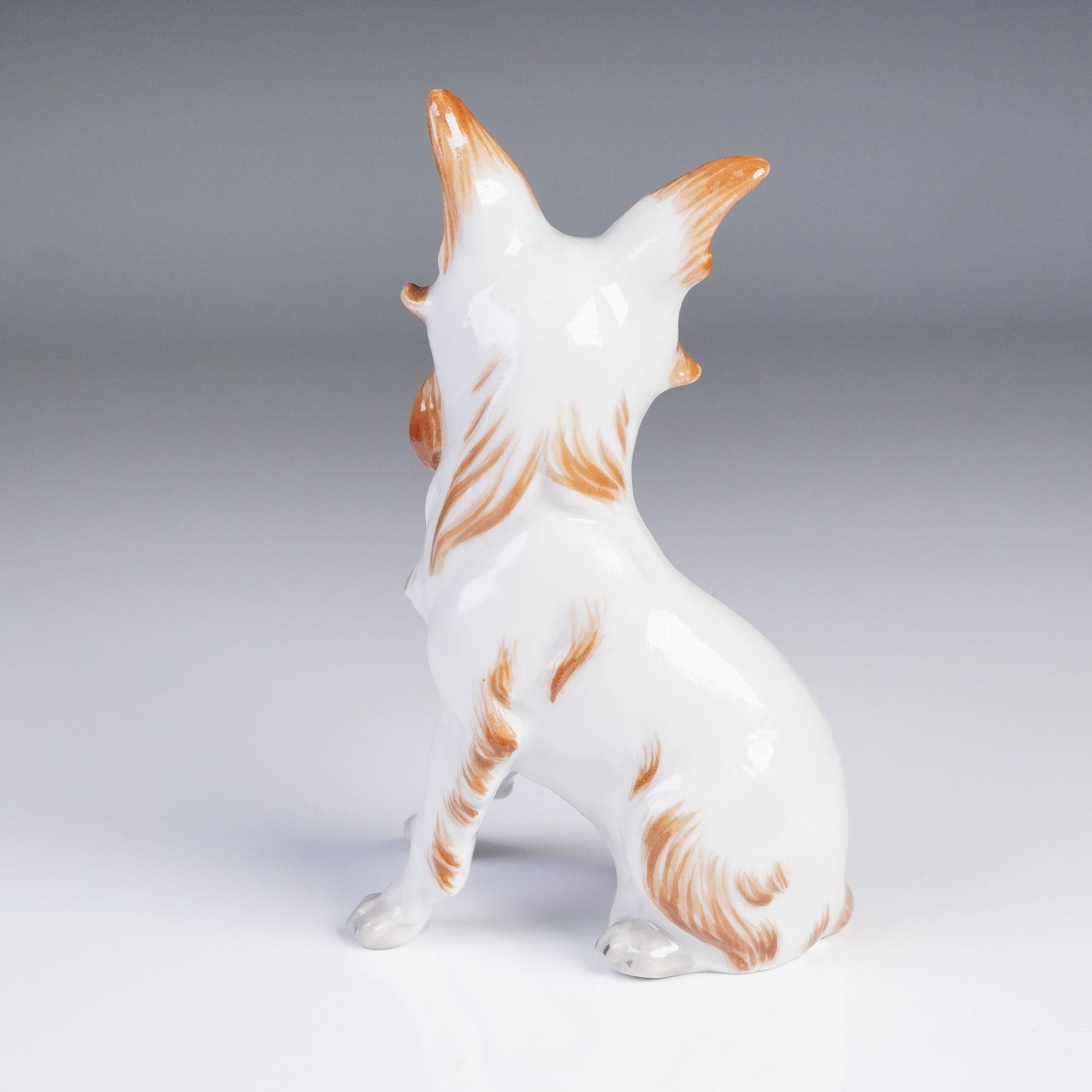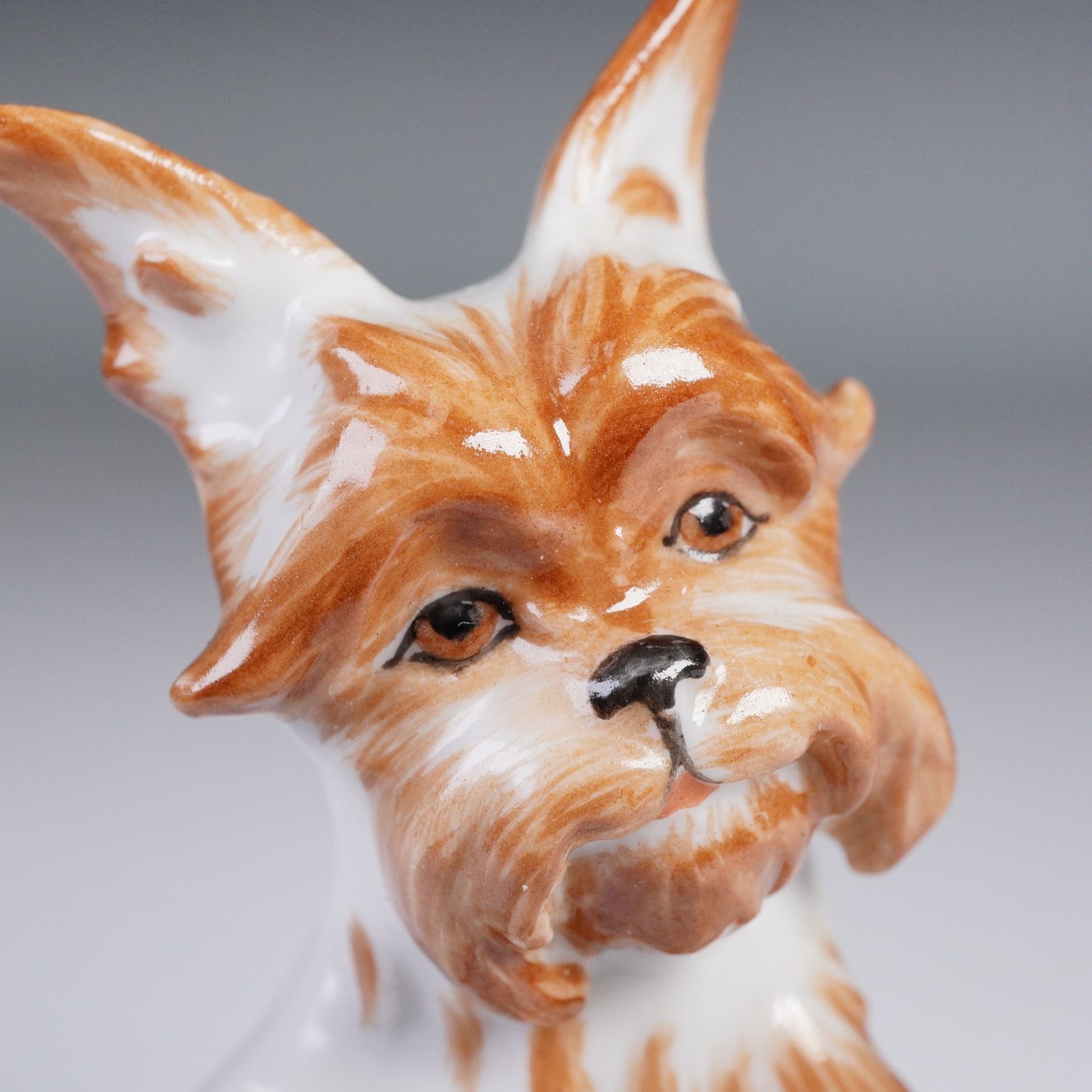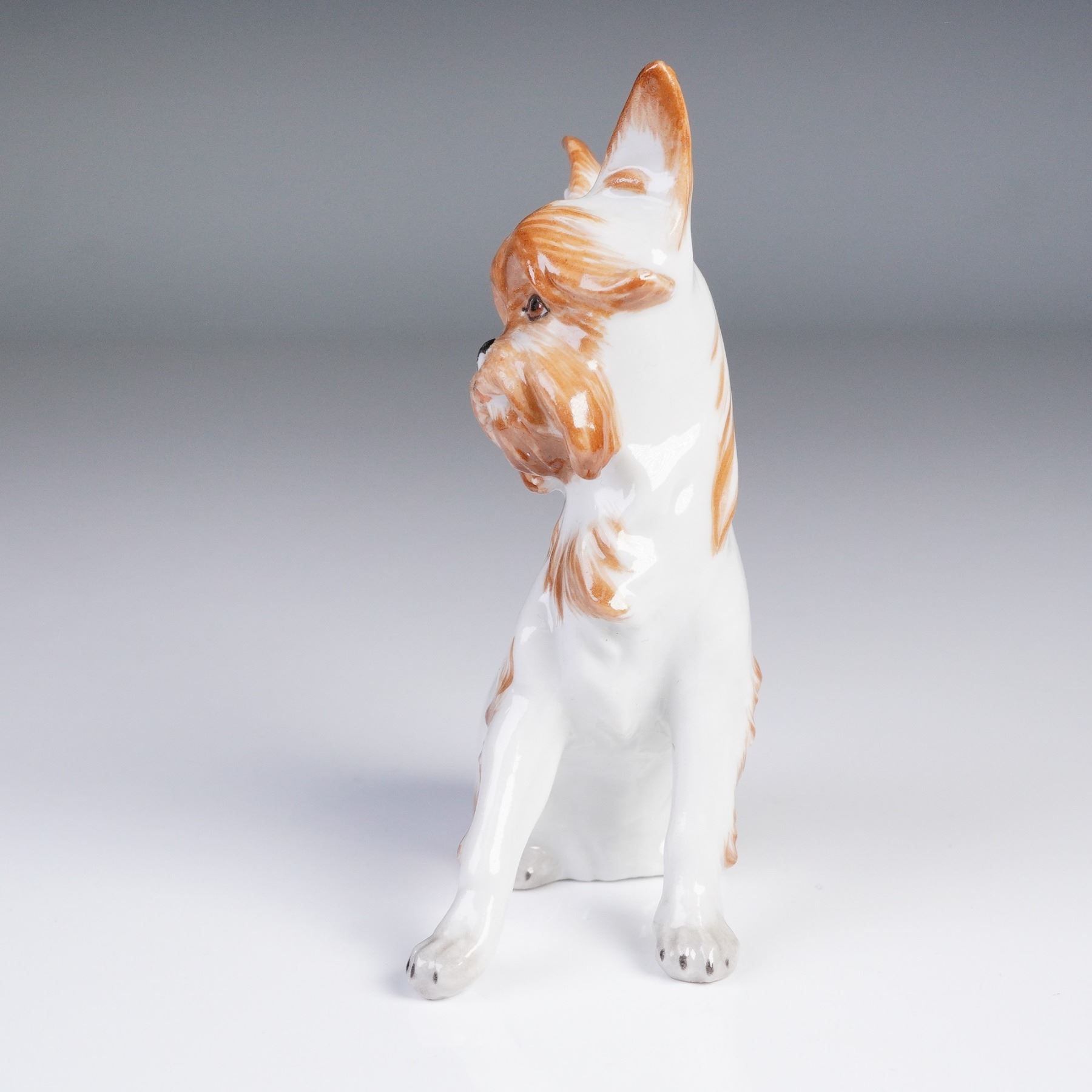 Augarten porcelain figurine of a seated griffon, modeled with upright ears and expressive detailing. The figure is hand-painted in white with light brown patches, capturing the character of the breed with fine facial expression and textured coat. Marked on the underside with the Augarten Wien Austria backstamp in red and blue, along with model numbers. A fine example of Vienna's renowned porcelain tradition.