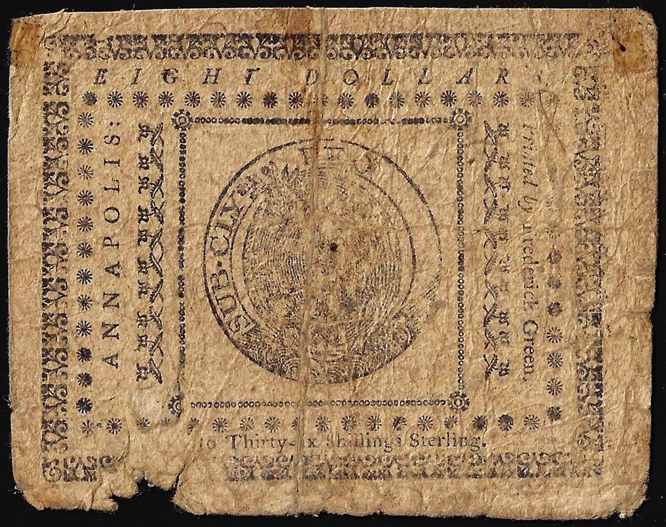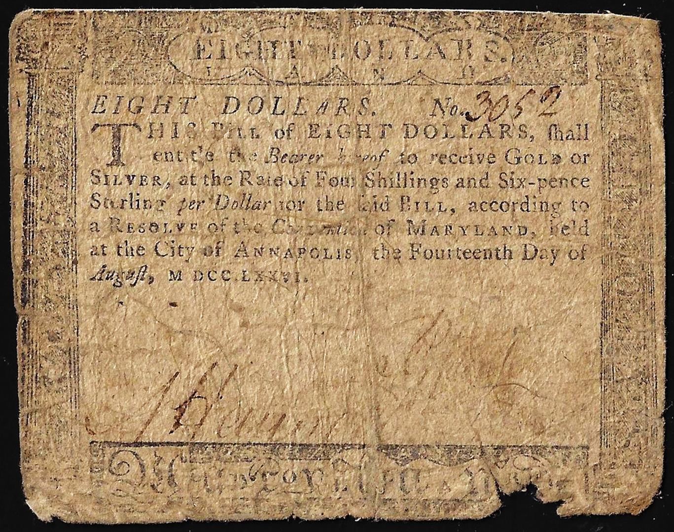 One August 14, 1776 $8 Maryland Colonial Currency Note.