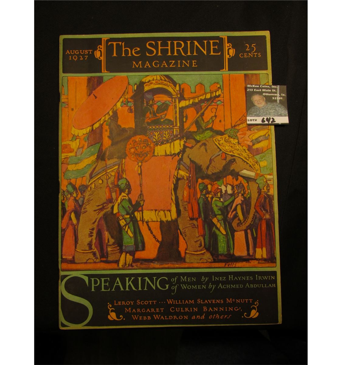 August 1927 "The Shrine Magazine", "Speaking of Men", by Inez Haynes Irwin, & "Speaking of Women" by Achmed Abdullah. Cover art of Elephant with gondola.
