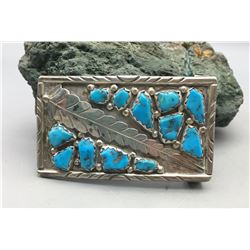 Description: Offered for sale in this lot is a beautiful Zuni made belt buckle set with twelve turquoise stones which are accented with sterling silve