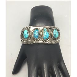 Description: For sale in this lot is a nice, vintage bracelet with four great looking turquoise stones set in sterling silver with floral appliqu