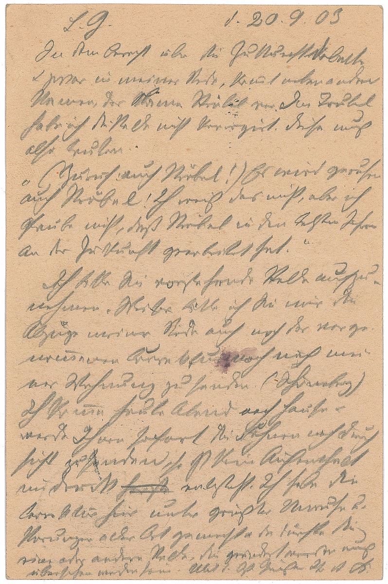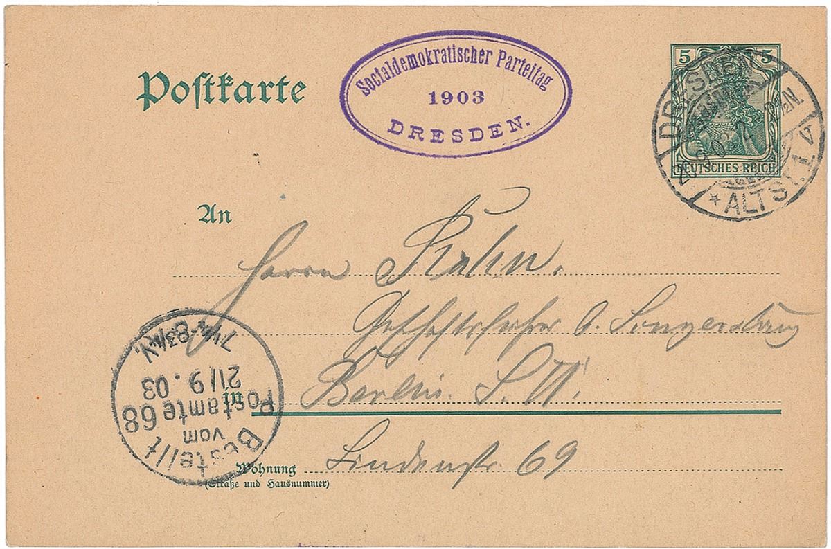 German politician (1840–1913) who was one of the founders of Germany’s oldest political party, the Social Democratic Party. ALS in German in pencil, signed “Ihr A. B.,” one page on a 3.5 x 5.5 postcard, September 20, 1903. Untranslated letter mentioning journalist Heinrich Stroebel. In fine condition, with a small stain to the center affecting a couple words.
