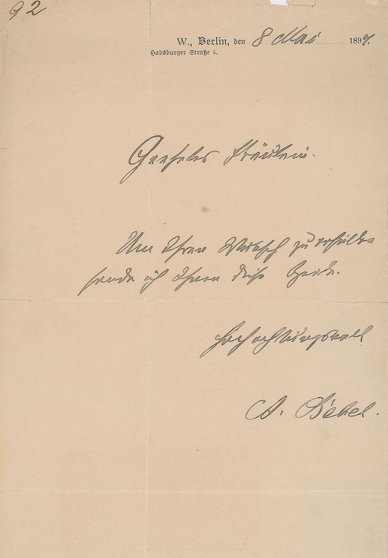 German politician (1840–1913) who was one of the founders of Germany's oldest political party, the Social Democratic Party. ANS in German, signed “A. Bebel,” one page, 5.5 x 8, May 8, 1897. A brief note, in full (translated): "To fulfill your wish I send you this line. Respectfully, A. Bebel." In very good to fine condition, with end splits to the intersecting folds.